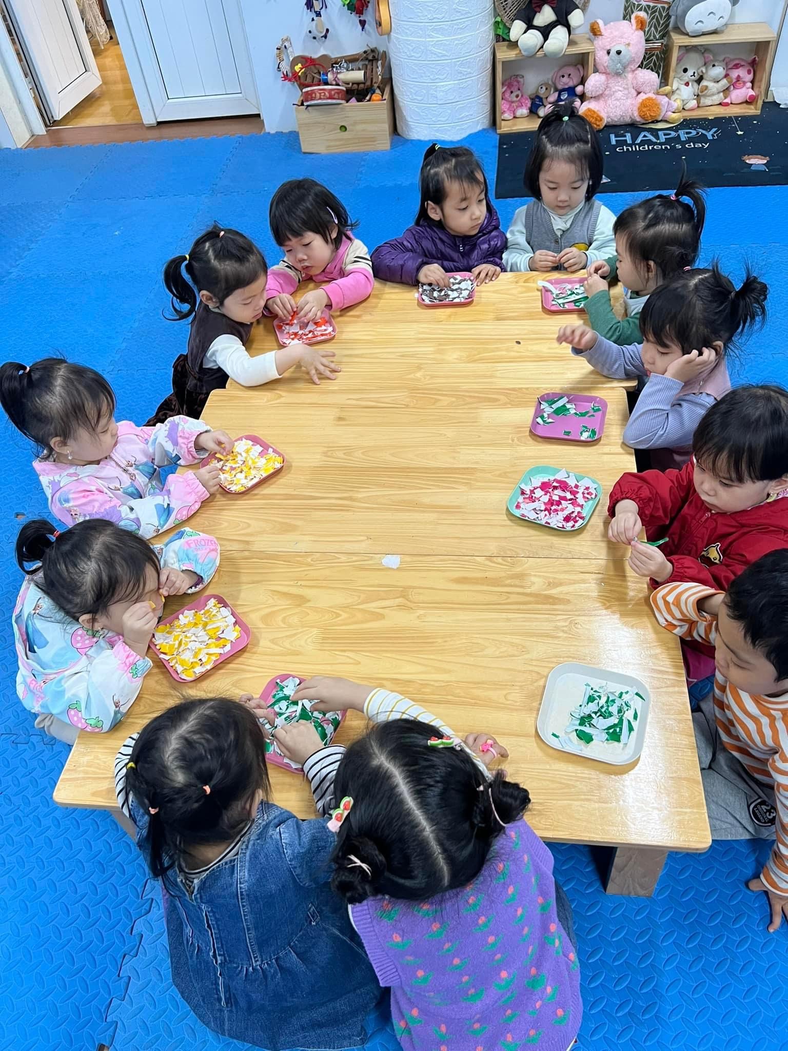 Các bé xé giấy vụn để chuẩn bị cho hoạt động Tạo hình