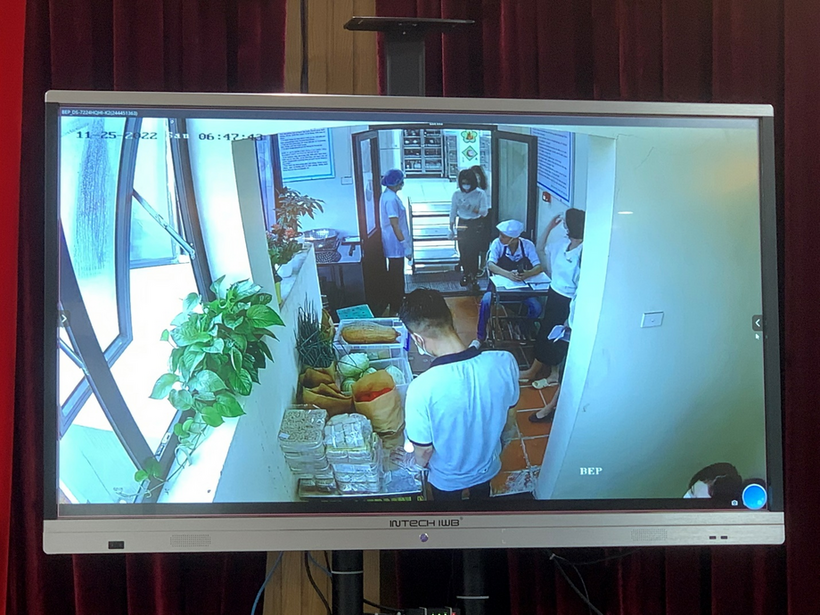 Giáo viên, nhân viên các trường MN trong Quận đang chăm chú theo dõi quy trình giao nhận thực phẩm qua màn hình truyền hình trực tiếp từ bếp.