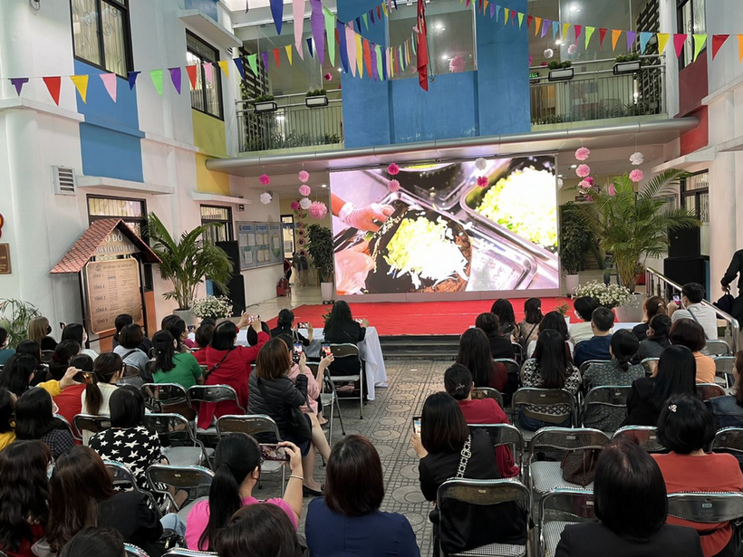 Trong buổi kiến tập, các đồng chí Cán bộ quản lý, giáo viên, nhân viên các nhà trường đã được dự giờ giao nhận thực phẩm, quy trình nấu ăn tại khu vực bếp của nhà trường bằng hình thức trực tiếp và trực tuyến tại phòng hội đồng tầng 4 và sân tầng 1 của trường mầm non Sao Mai.