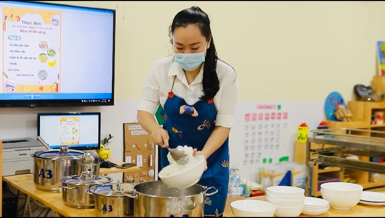 Tại đây, các trường còn được theo dõi cách chia ăn tại các khối lớp trong trường mầm non Sao Mai.