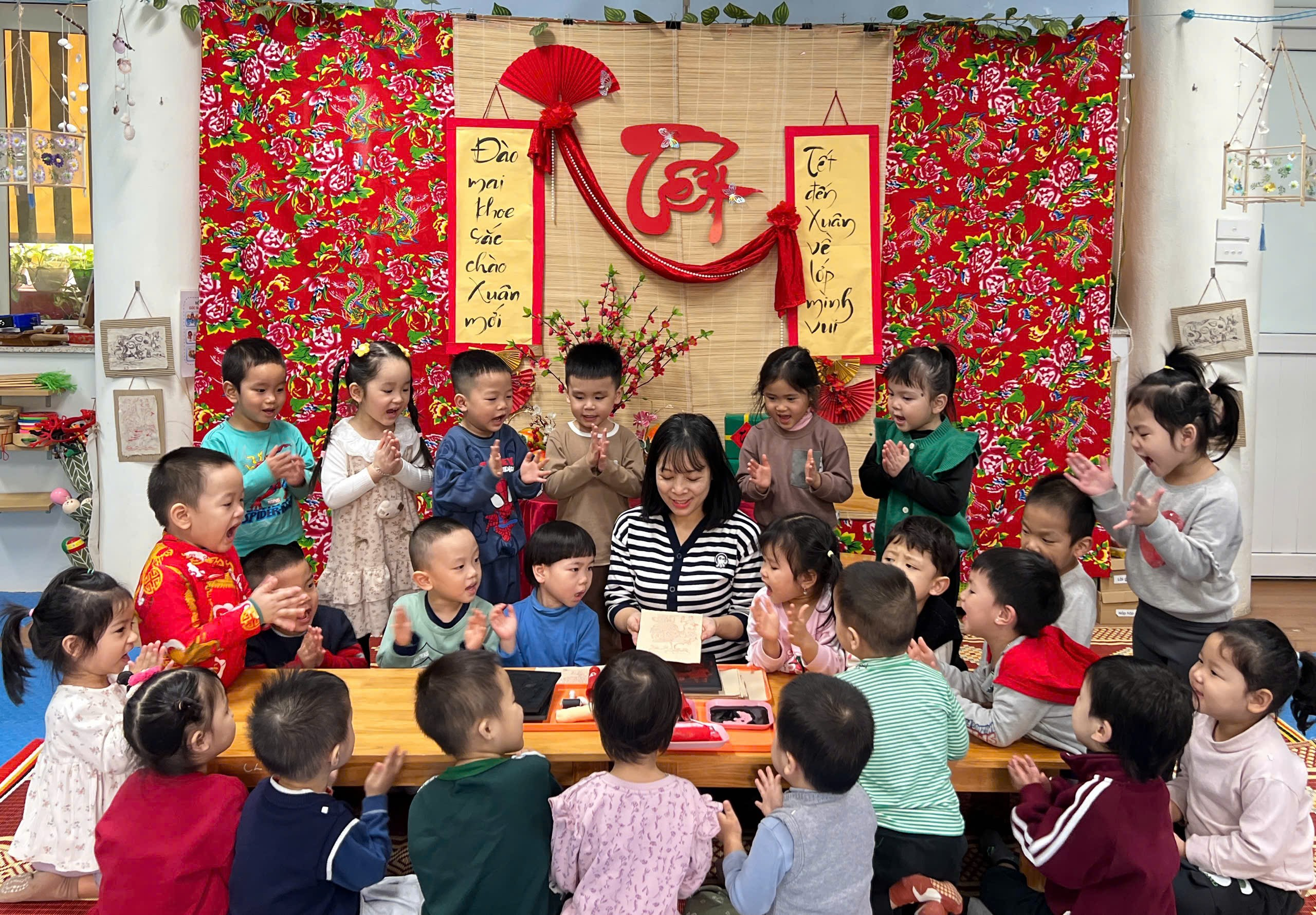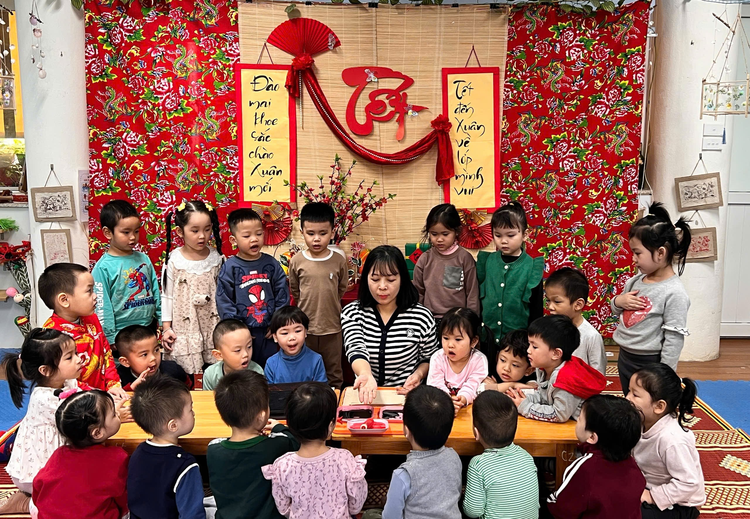 Trong không gian đậm sắc xuân, các bé được cô giáo giới thiệu về tranh Đông Hồ, ý nghĩa của từng bức tranh quen thuộc như: Em bé ôm gà, Em bé ôm cá, Gà trống, ...