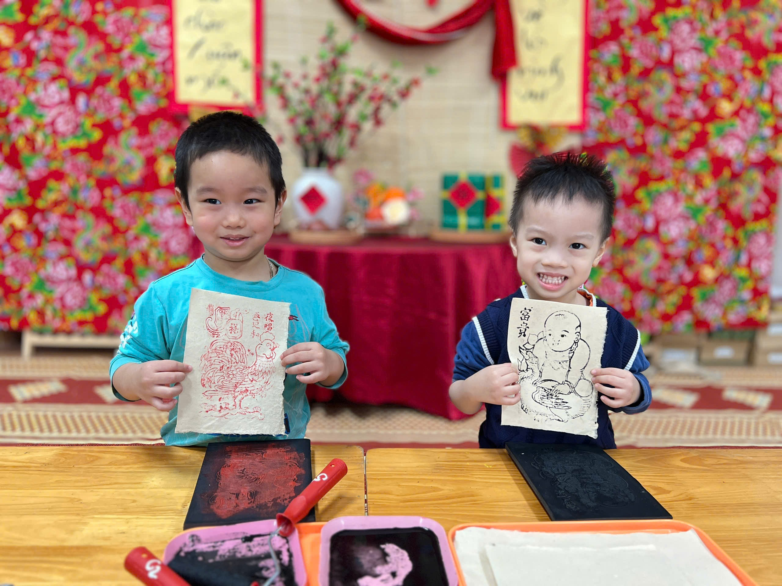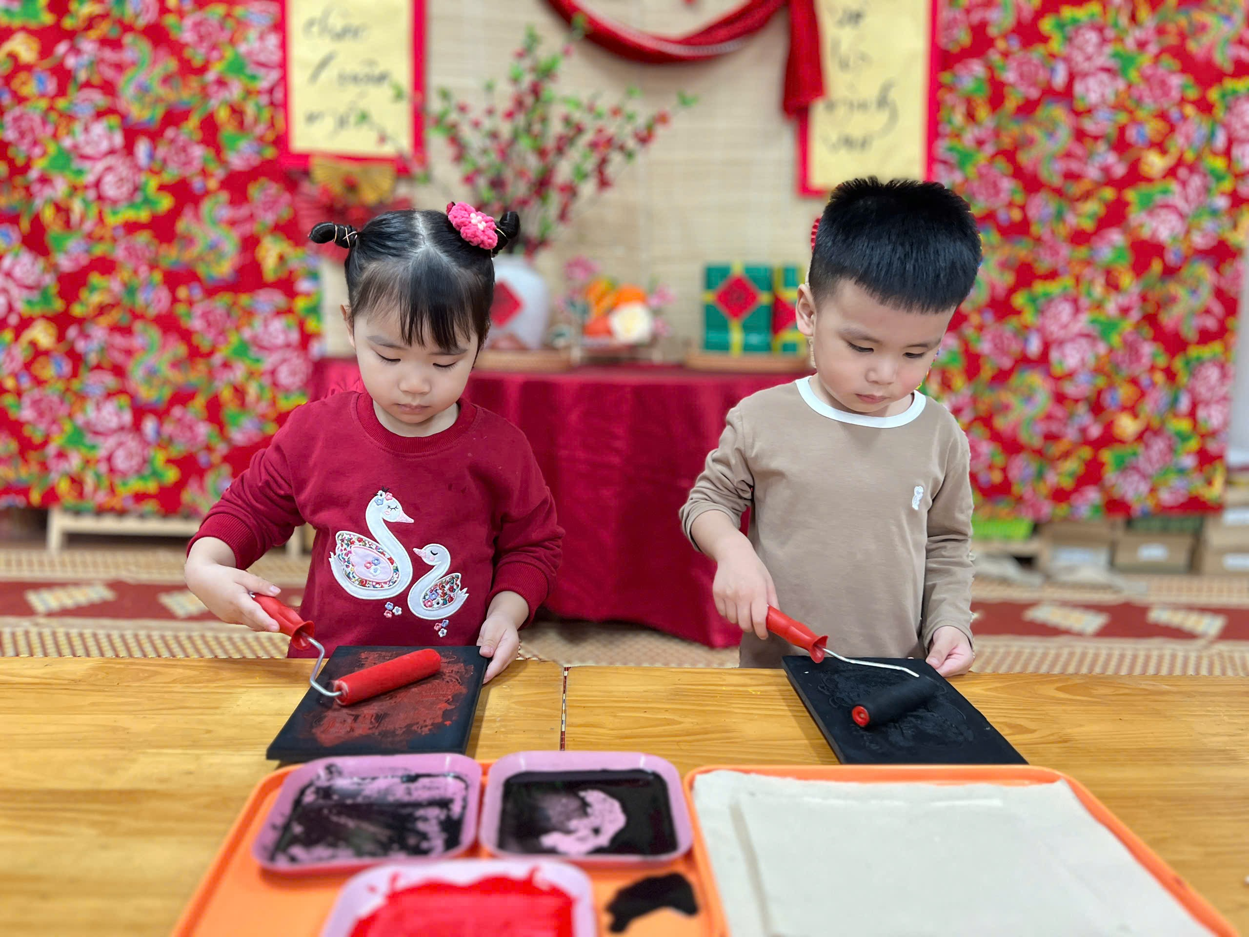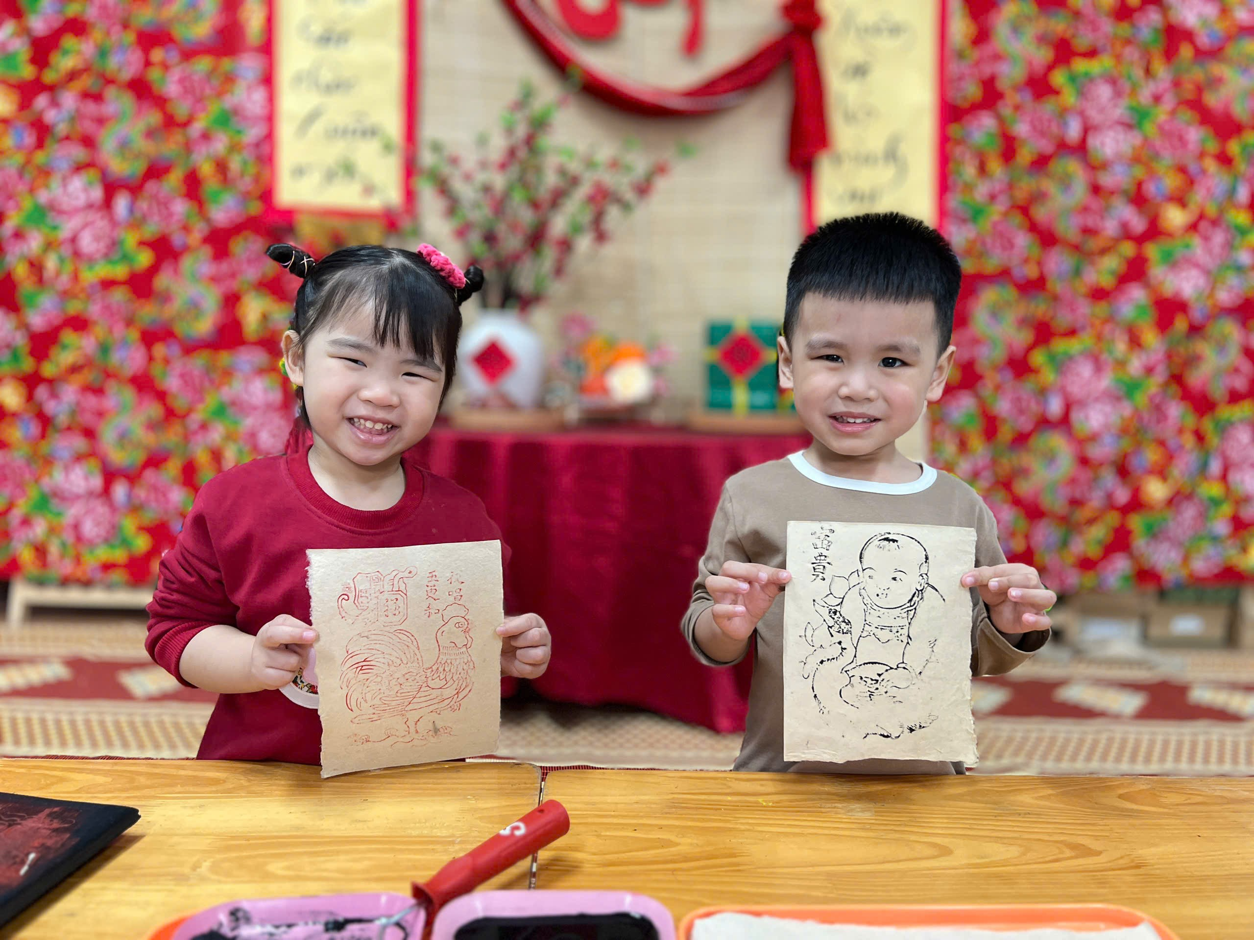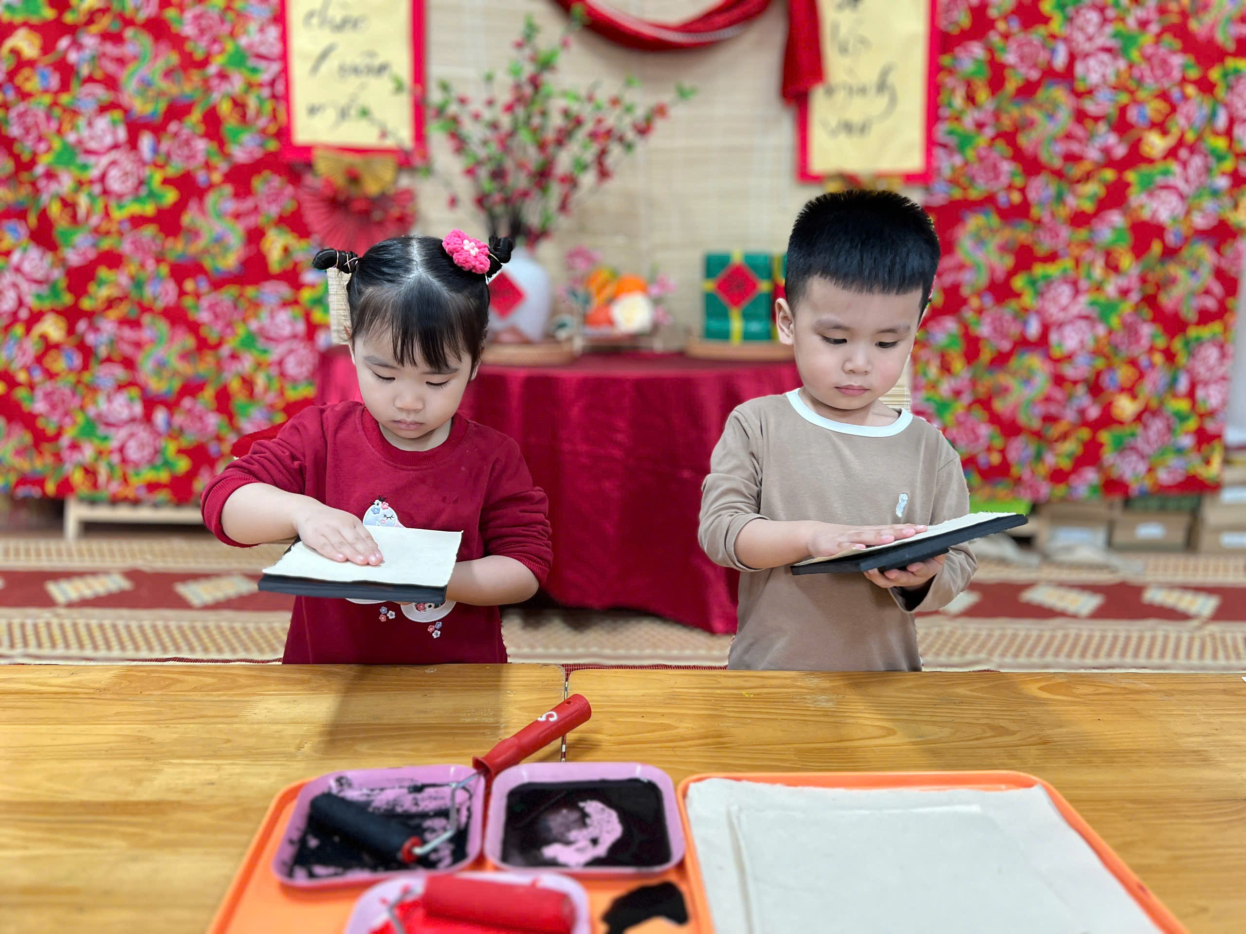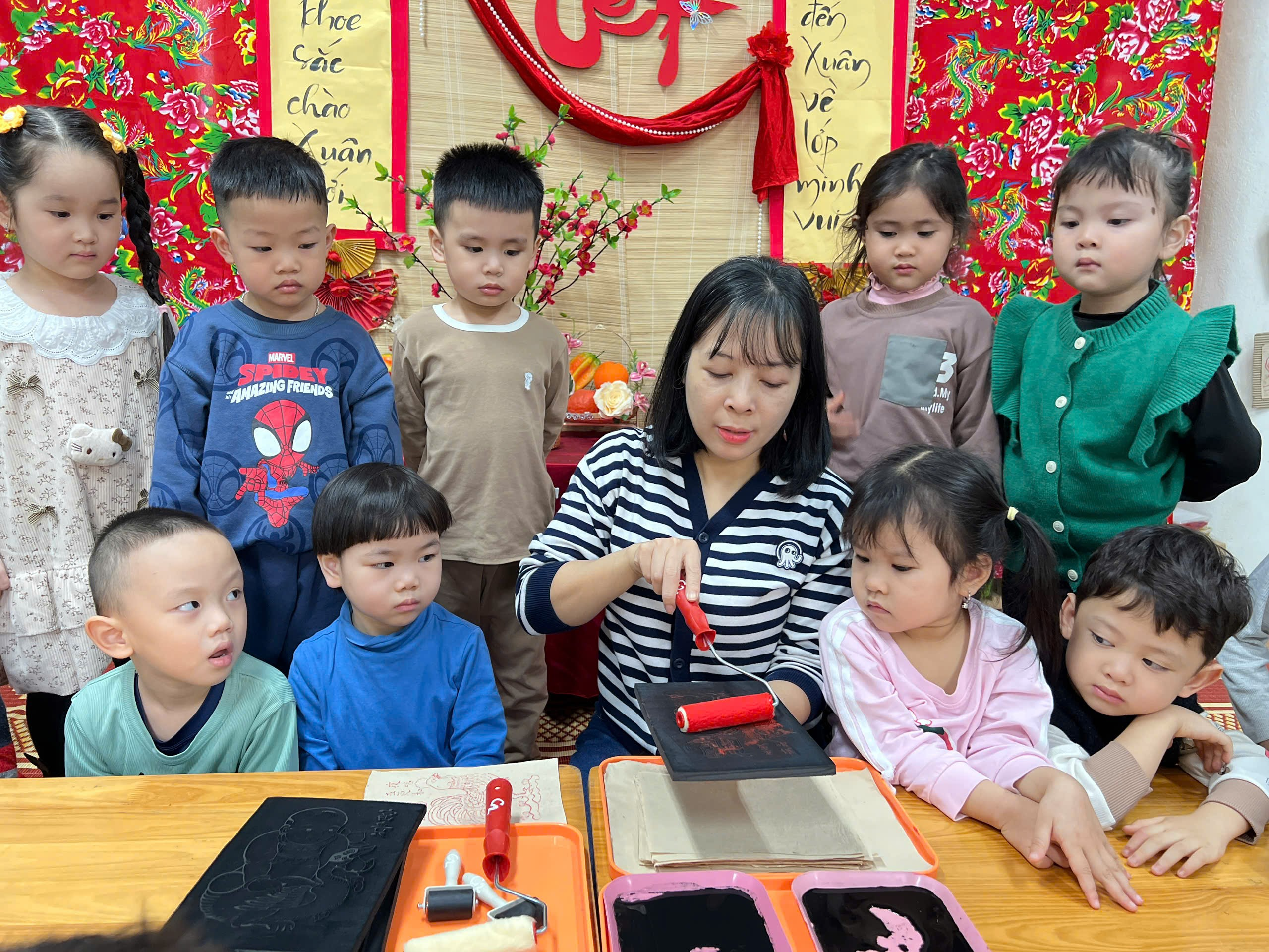 Dưới sự hướng dẫn của cô, các con tự tay lăn mực – đặt giấy – in tranh, hồi hộp chờ đợi và vỡ òa niềm vui khi tác phẩm của mình hiện lên rõ nét. Thông qua hoạt động, trẻ: Rèn luyện sự khéo léo của đôi tay, khả năng phối hợp tay – mắt, Phát triển tính kiên nhẫn, tập trung và sự tự tin, biết trân trọng và gìn giữ nét đẹp văn hóa truyền thống, có thêm niềm vui, hứng thú trong các hoạt động trải nghiệm
