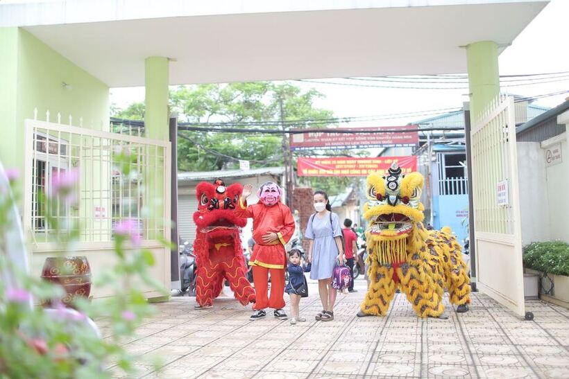 Ông Địa và những chú Lân đón Phụ huynh và các bé từ cổng trường.