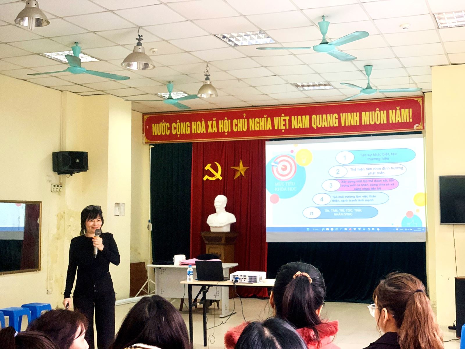 Buổi học rất sôi nổi, đầy ắp tiếng cười và những chia sẻ nhiệt tình giữa giảng viên và học viên. Với sự nhiệt tâm của cô Trần Thị Ngoan, các giáo viên có được tâm trạng vui vẻ, hạnh phúc và tích cực phát biểu, đưa ra ý kiến của mình mang đến hiệu quả cao trong buổi bồi dưỡng.