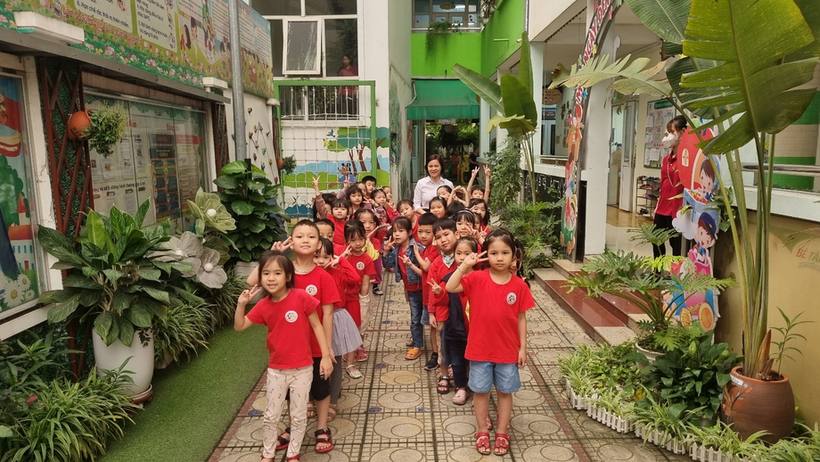 Các cô giáo và các con chụp ảnh lưu niệm tại trường tiểu học Ba Đình