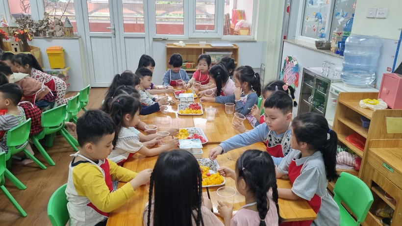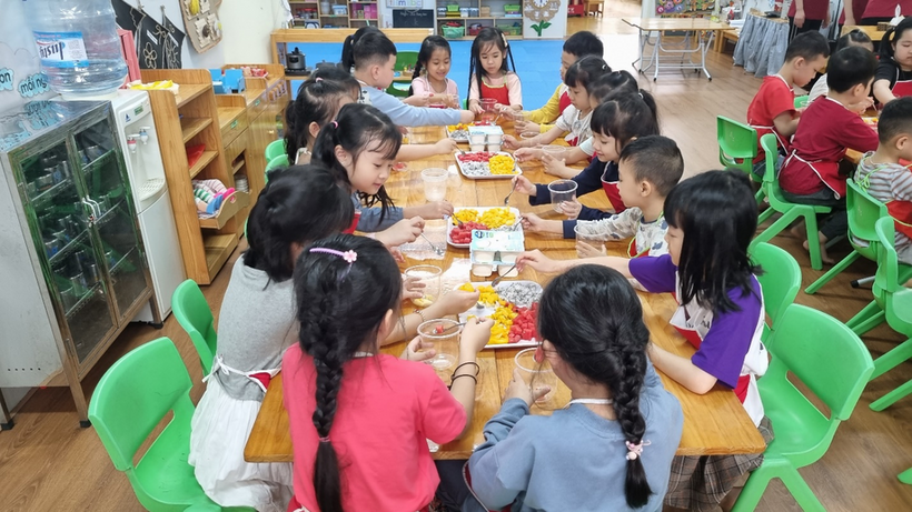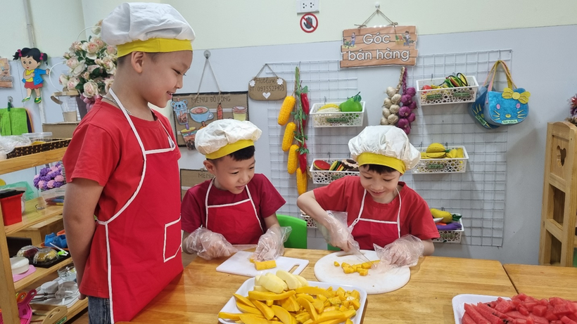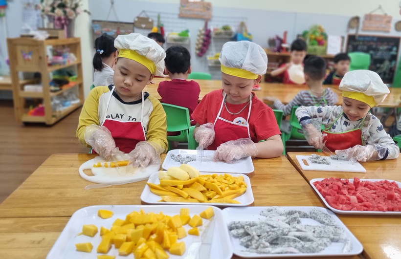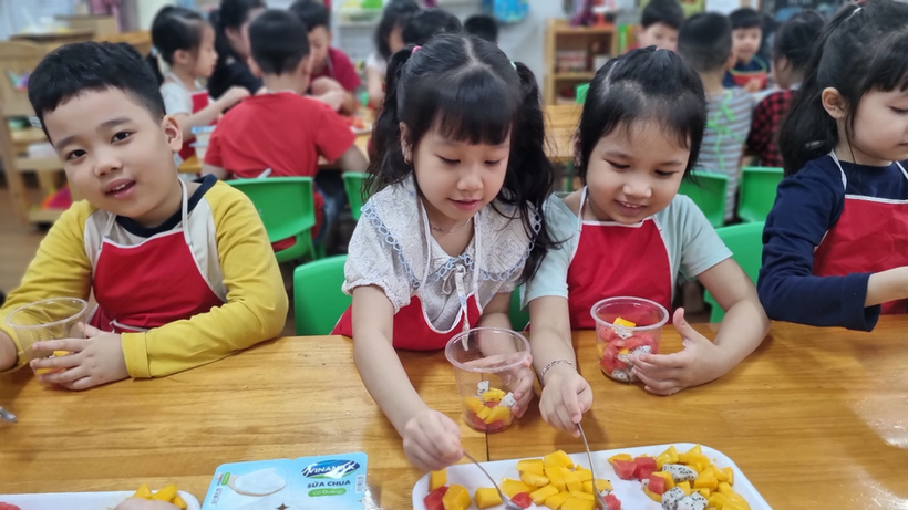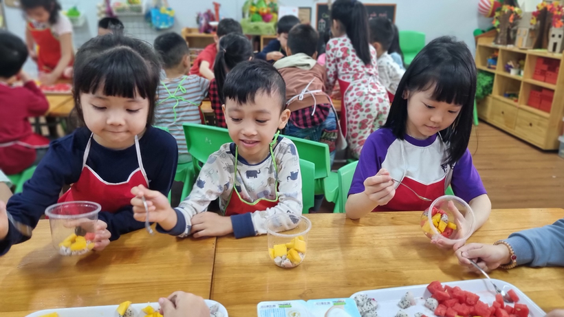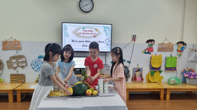 Từ những kỹ năng đơn giản như chuẩn bị đồ dùng, lấy đồ dùng, cách sử dụng dao… đến thao tác phức tạp hơn như cắt, trộn hoa quả...Các bé được tự mình tạo ra món ăn và tỏ ra hết sức hứng thú, tích cực tham gia hoạt động.