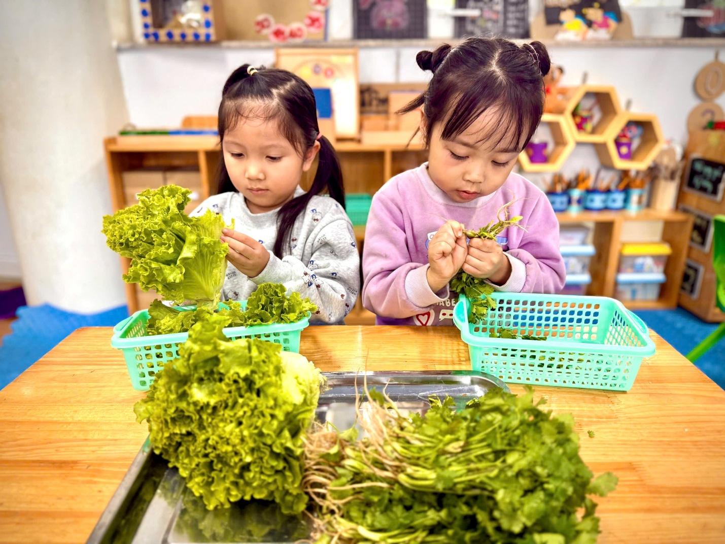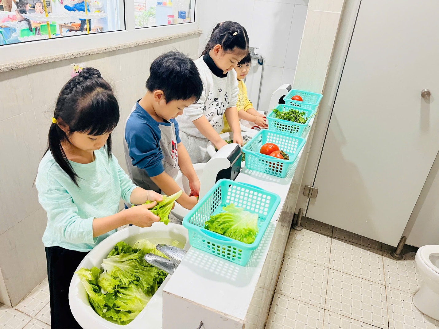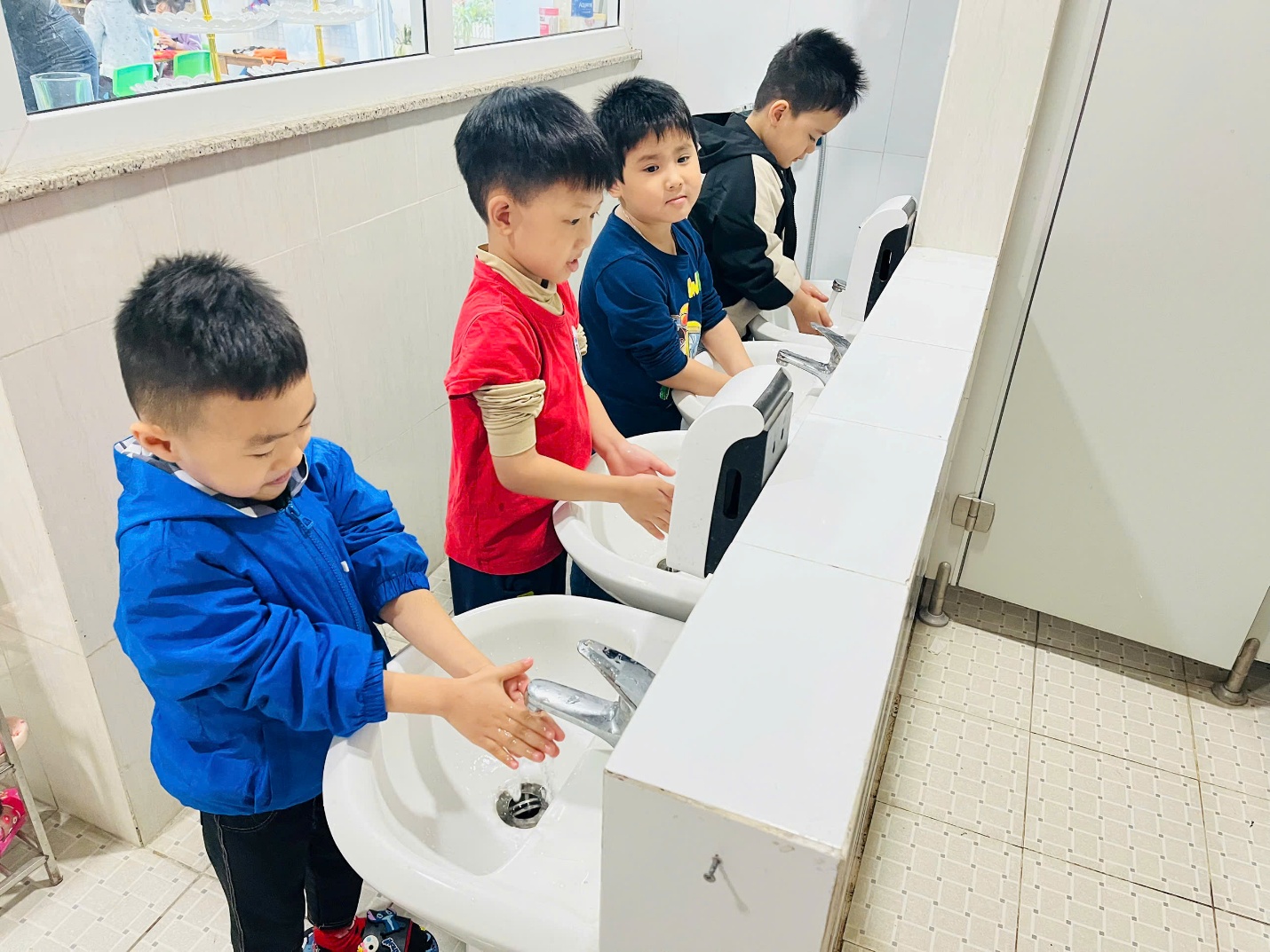 Các bé đang vệ sinh sạch sẽ đôi tay trước khi làm.