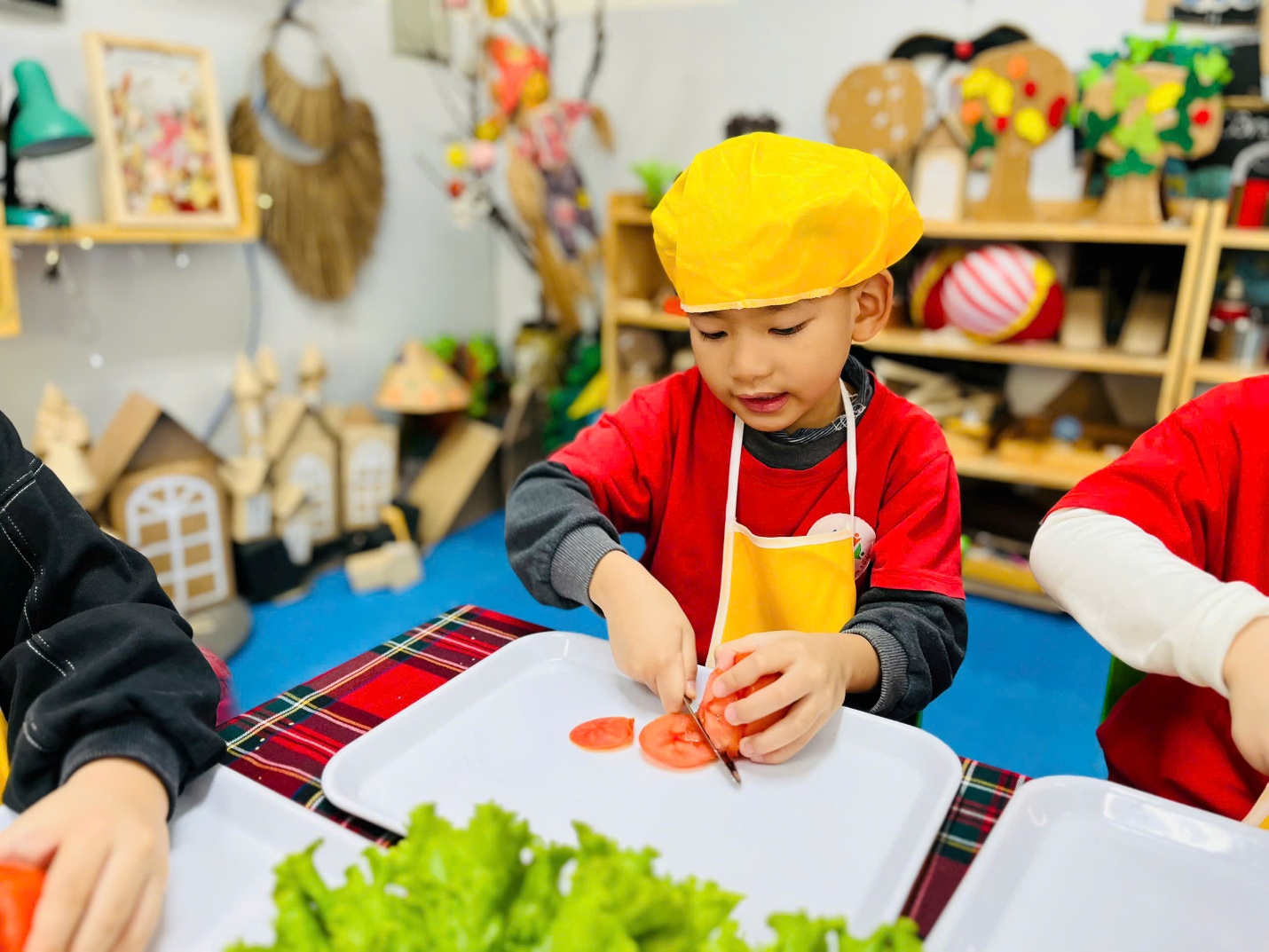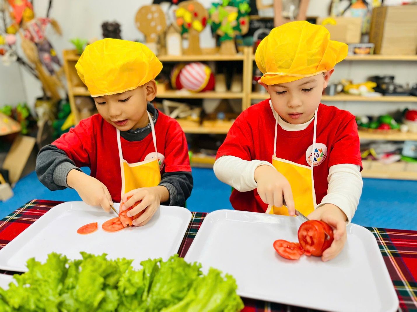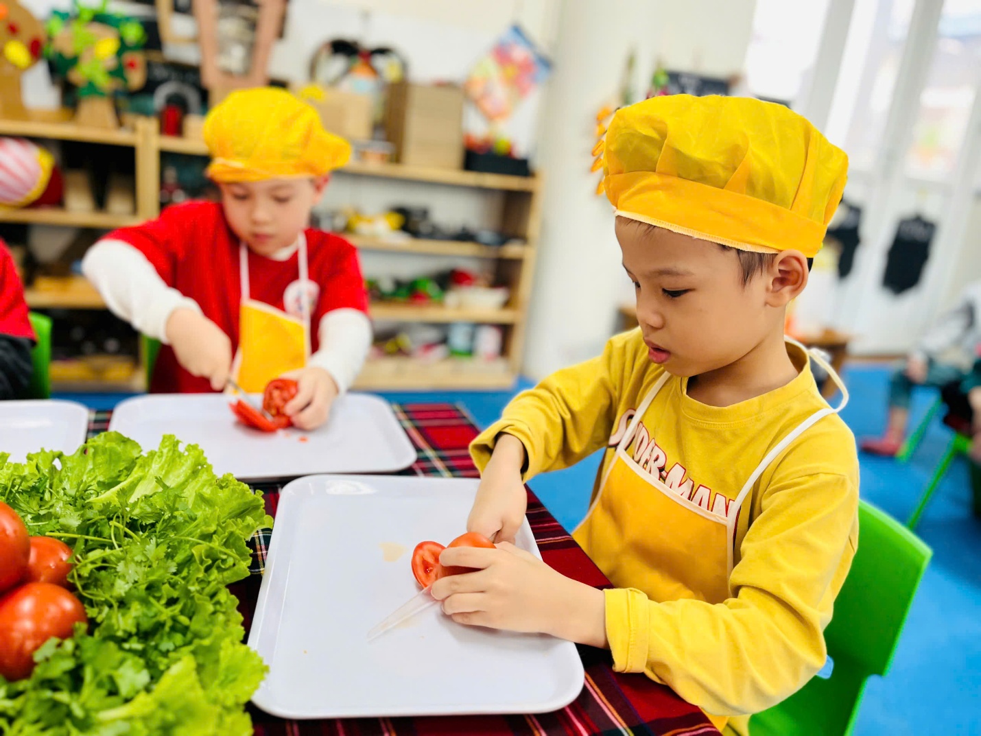 Các bé thật khéo léo sử dụng dao thái cà chua đều theo đường cô giáo đã khứa.