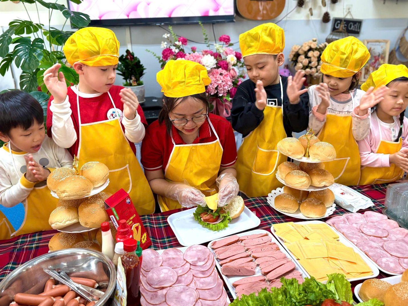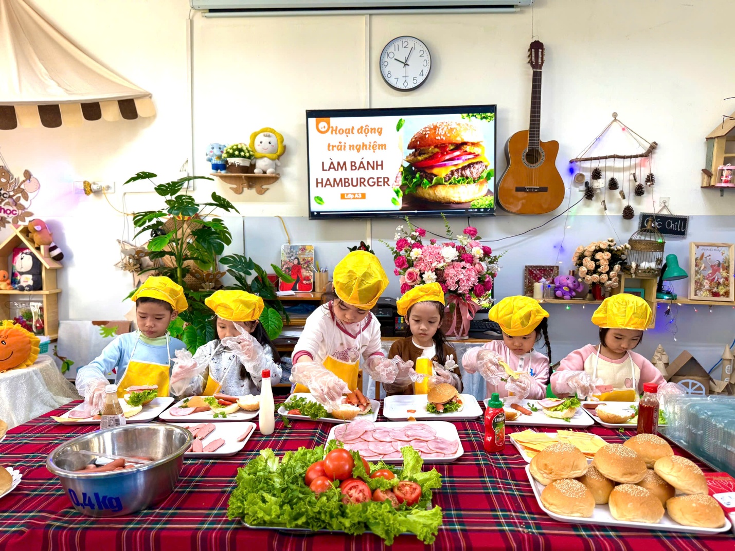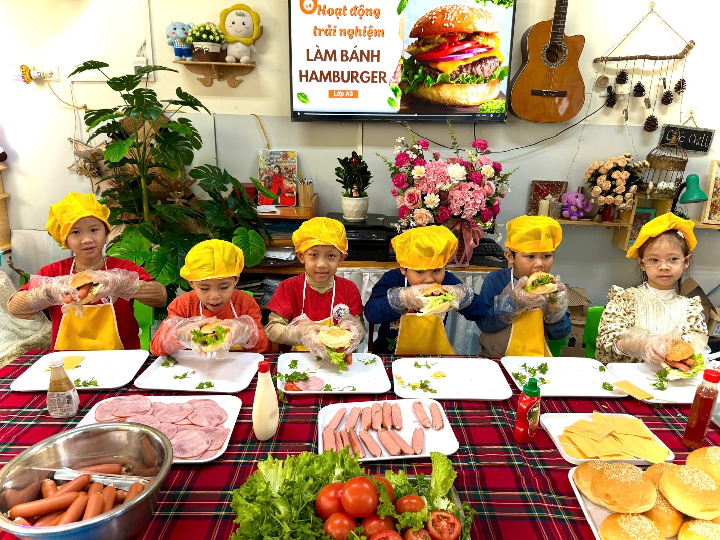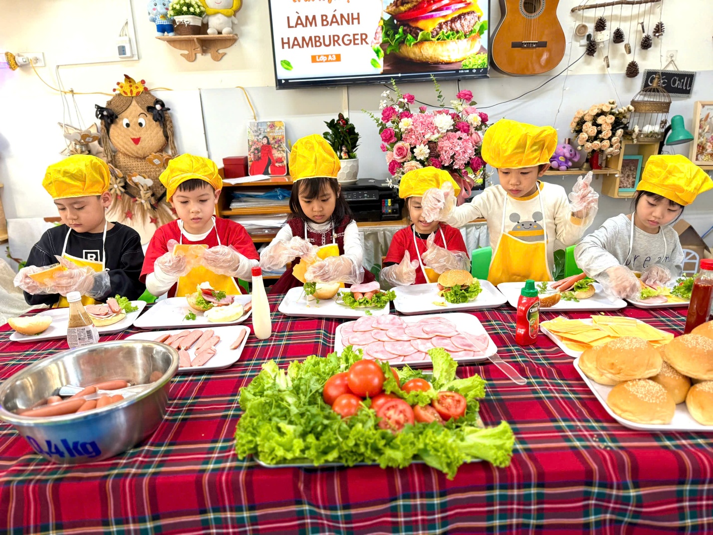 Hôm nay, không gian lớp A3 bỗng trở nên nhộn nhịp và đầy hứng khởi khi các bạn nhỏ bắt đầu hoạt động trải nghiệm “Tự tay làm bánh hamburger”. Với đôi bàn tay nhỏ xinh nhưng đầy sự tập trung và háo hức, các con đã trải qua một hành trình thú vị từ việc chuẩn bị nguyên liệu đến hoàn thiện chiếc bánh của riêng mình. Hoạt động không chỉ giúp trẻ rèn sự khéo léo, kỹ năng tự phục vụ mà còn nuôi dưỡng tinh thần trách nhiệm, khả năng phối hợp nhóm và thói quen giữ gìn vệ sinh trong khi làm việc. Mỗi bước, mỗi thao tác đều là một trải nghiệm mới, giúp trẻ hiểu rằng để tạo nên một sản phẩm ngon mắt, ngon miệng cần rất nhiều sự cẩn thận và tỉ mỉ.