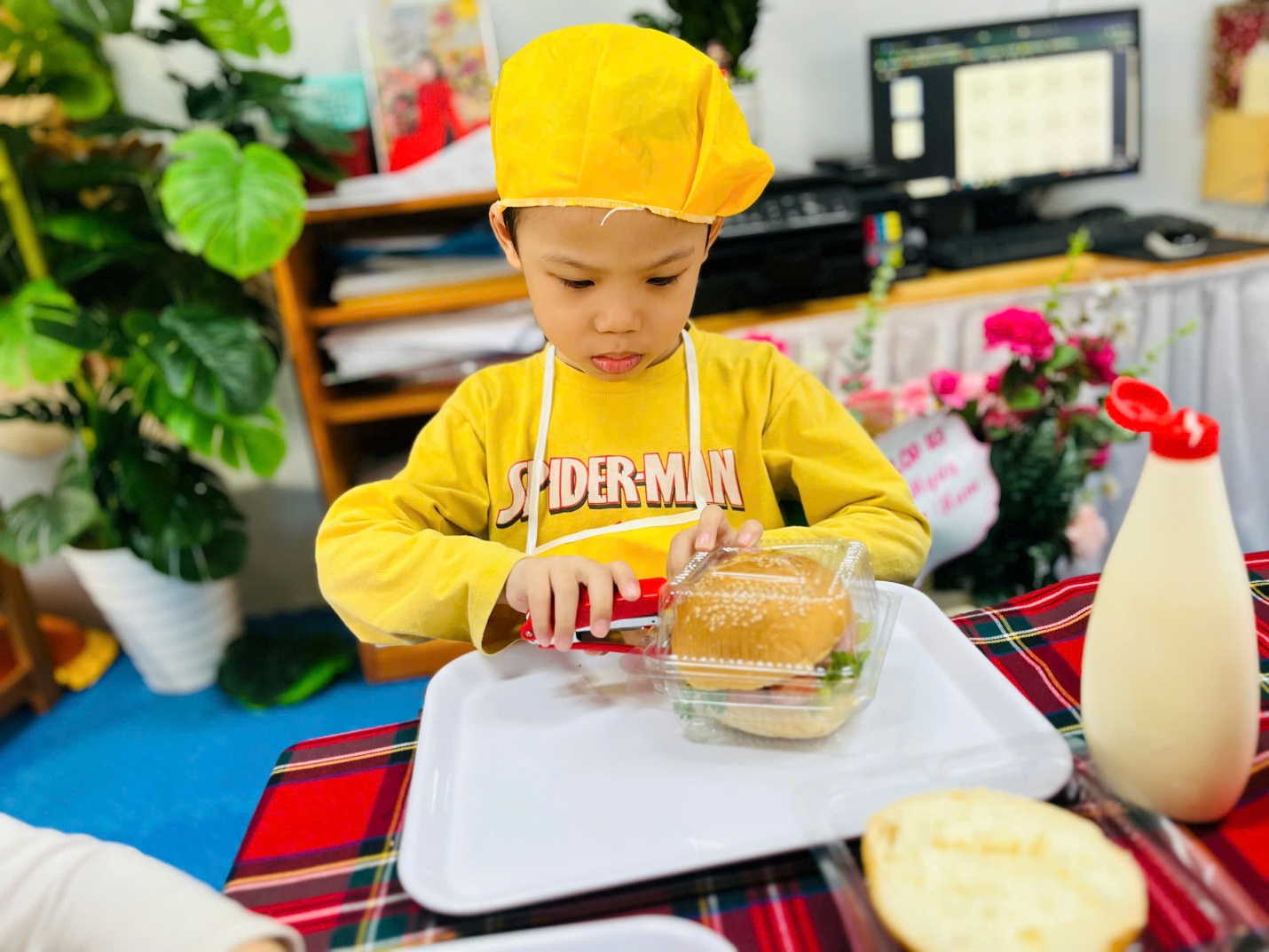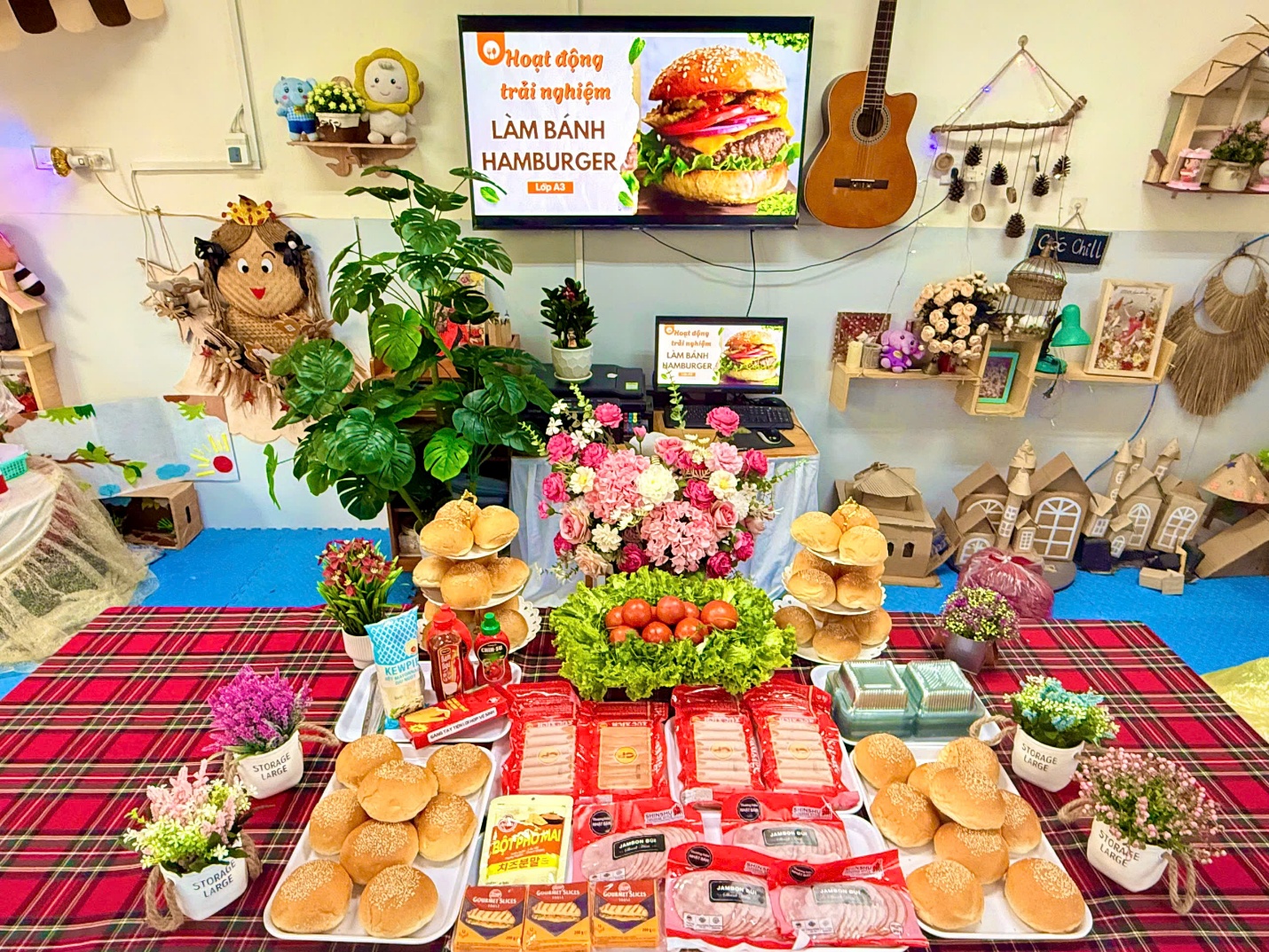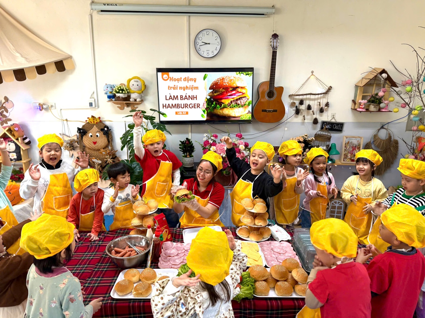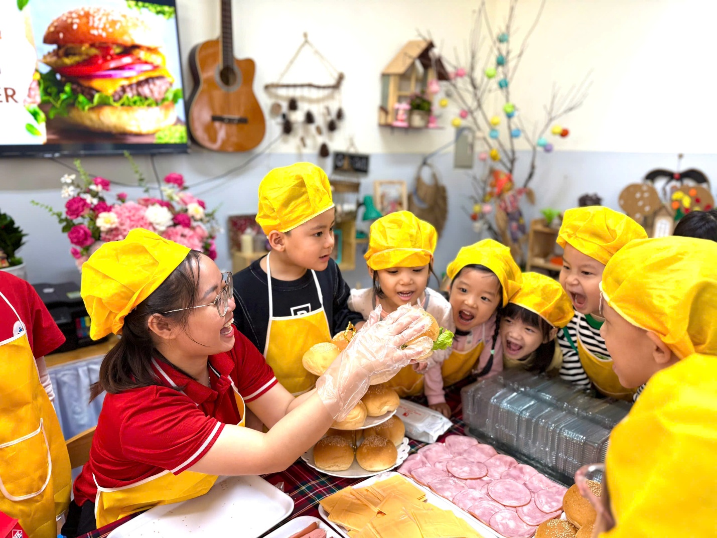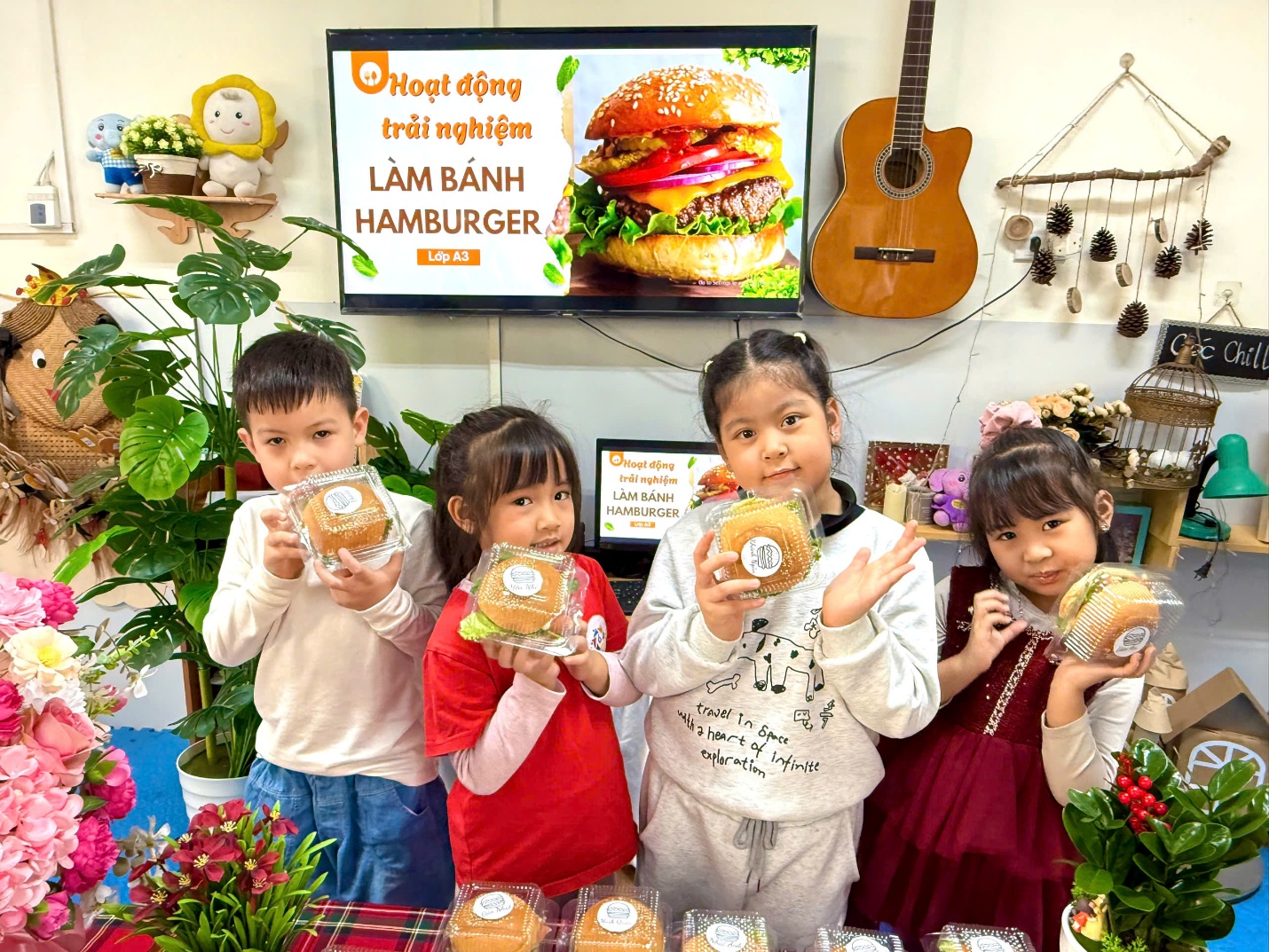 Hôm nay, không gian lớp A3 bỗng trở nên nhộn nhịp và đầy hứng khởi khi các bạn nhỏ bắt đầu hoạt động trải nghiệm “Tự tay làm bánh hamburger”. Với đôi bàn tay nhỏ xinh nhưng đầy sự tập trung và háo hức, các con đã trải qua một hành trình thú vị từ việc chuẩn bị nguyên liệu đến hoàn thiện chiếc bánh của riêng mình. Hoạt động không chỉ giúp trẻ rèn sự khéo léo, kỹ năng tự phục vụ mà còn nuôi dưỡng tinh thần trách nhiệm, khả năng phối hợp nhóm và thói quen giữ gìn vệ sinh trong khi làm việc. Mỗi bước, mỗi thao tác đều là một trải nghiệm mới, giúp trẻ hiểu rằng để tạo nên một sản phẩm ngon mắt, ngon miệng cần rất nhiều sự cẩn thận và tỉ mỉ.