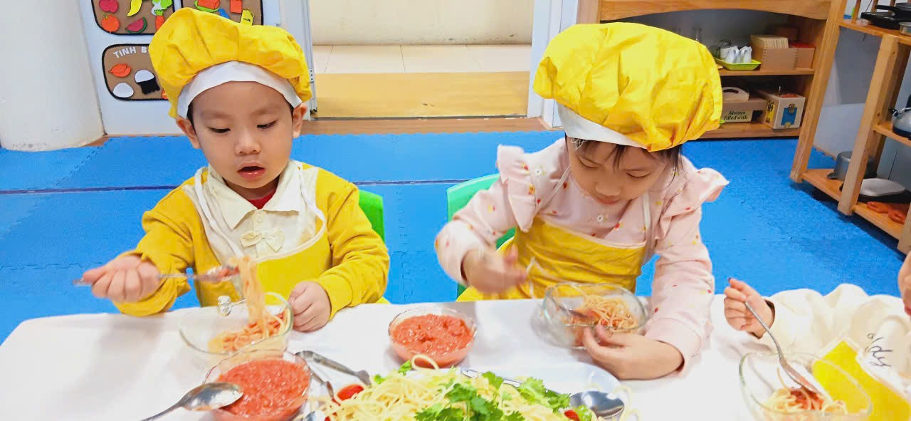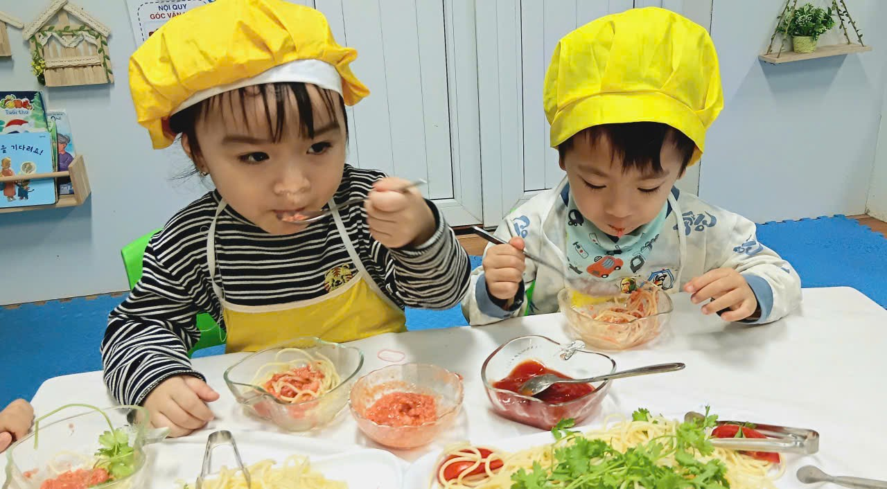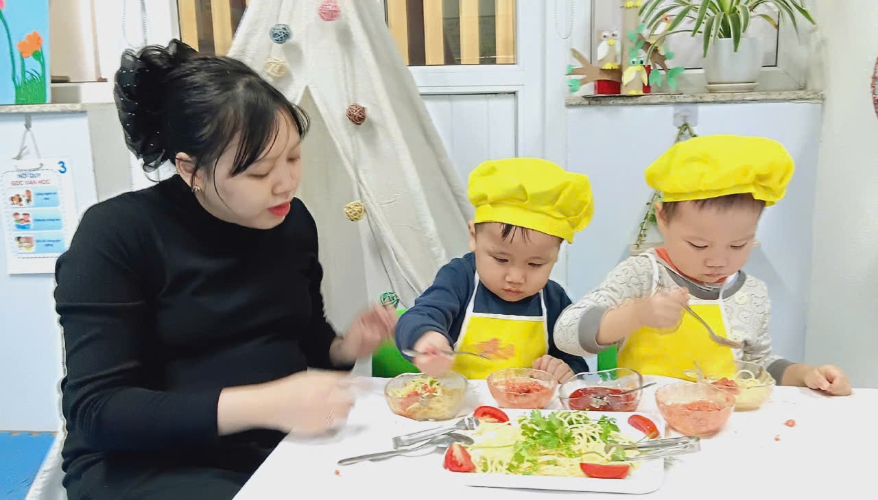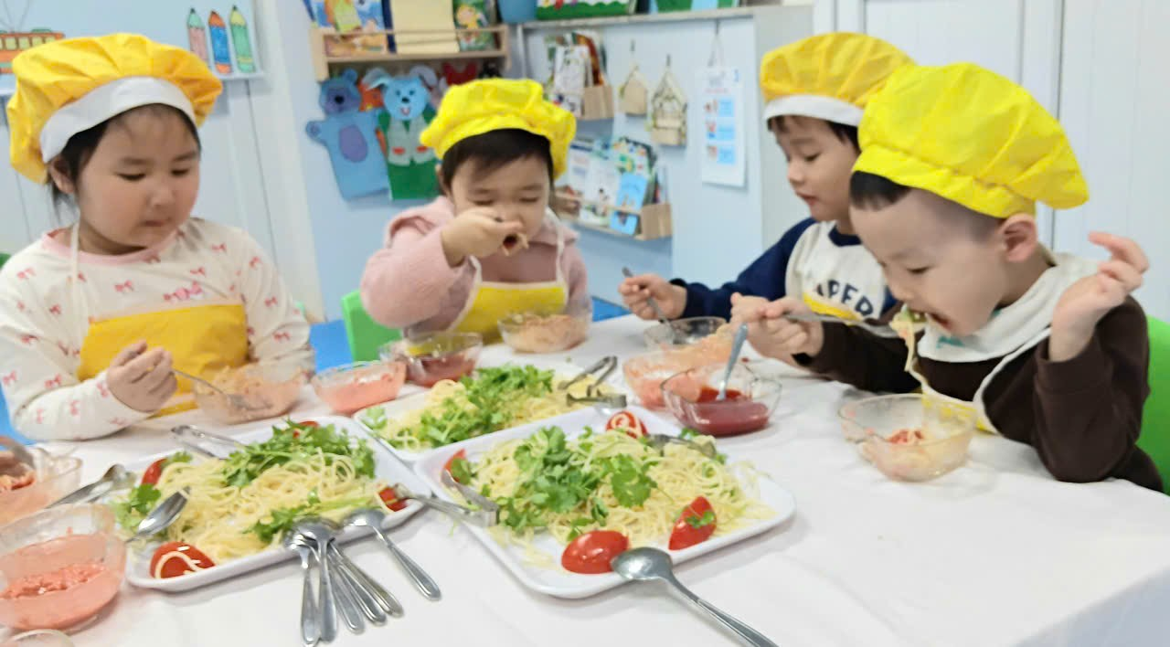 Dưới sự hướng dẫn của cô giáo, các con được làm quen với nguyên liệu, rèn kỹ năng vận động tinh, phối hợp tay – mắt, khả năng tập trung, đồng thời học kỹ năng tự phục vụ và giữ vệ sinh khi ăn uống.