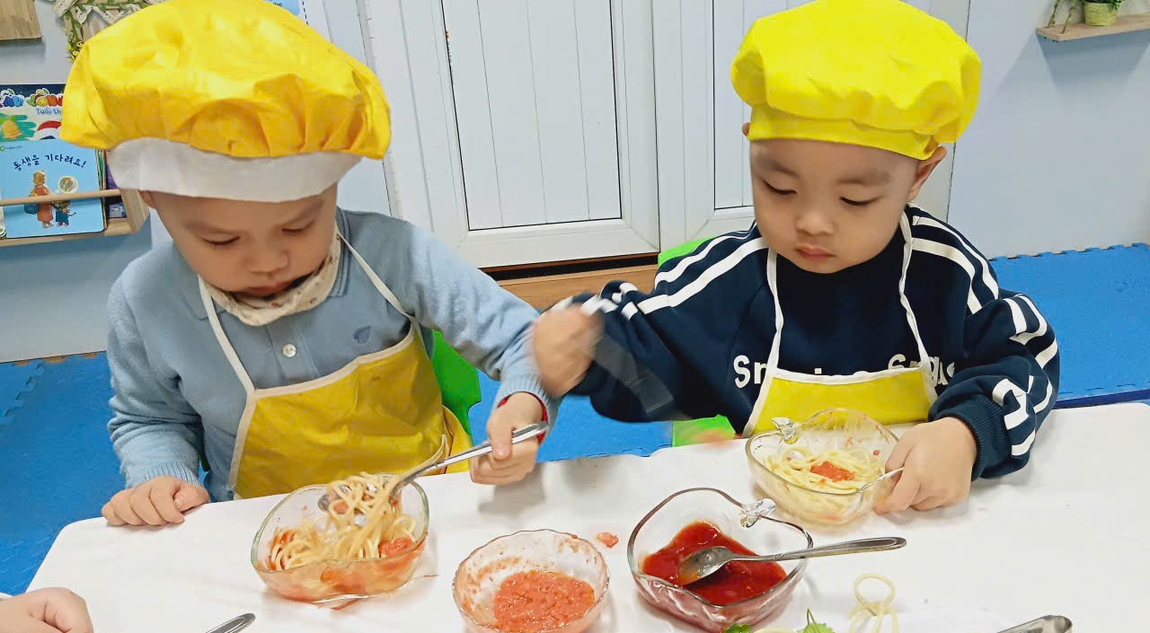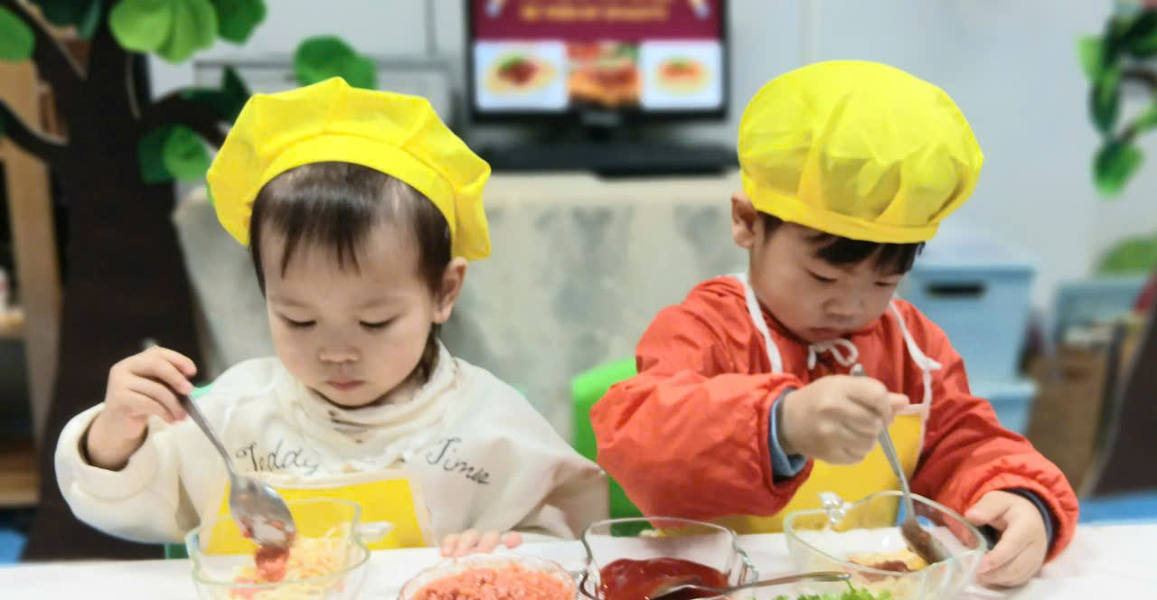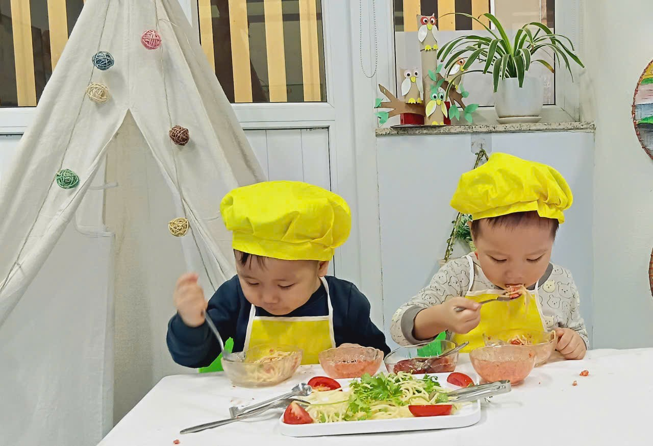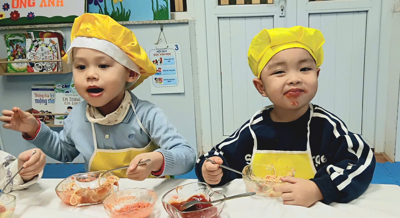 Dưới sự hướng dẫn của cô giáo, các con được làm quen với nguyên liệu, rèn kỹ năng vận động tinh, phối hợp tay – mắt, khả năng tập trung, đồng thời học kỹ năng tự phục vụ và giữ vệ sinh khi ăn uống.