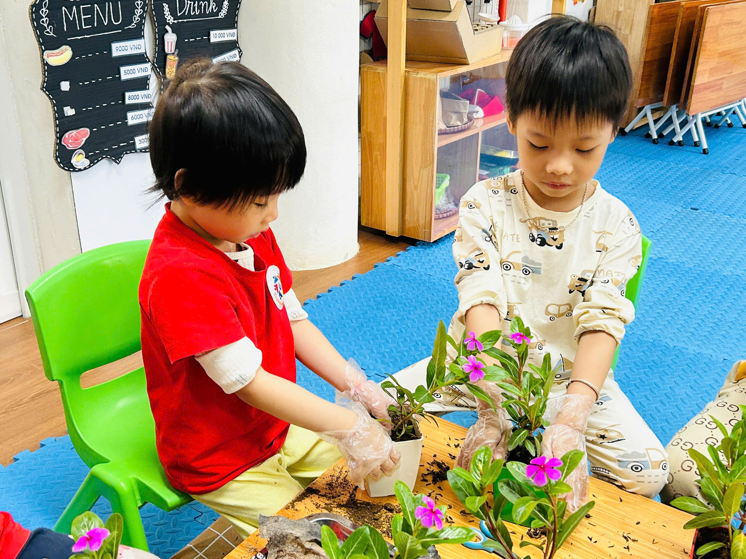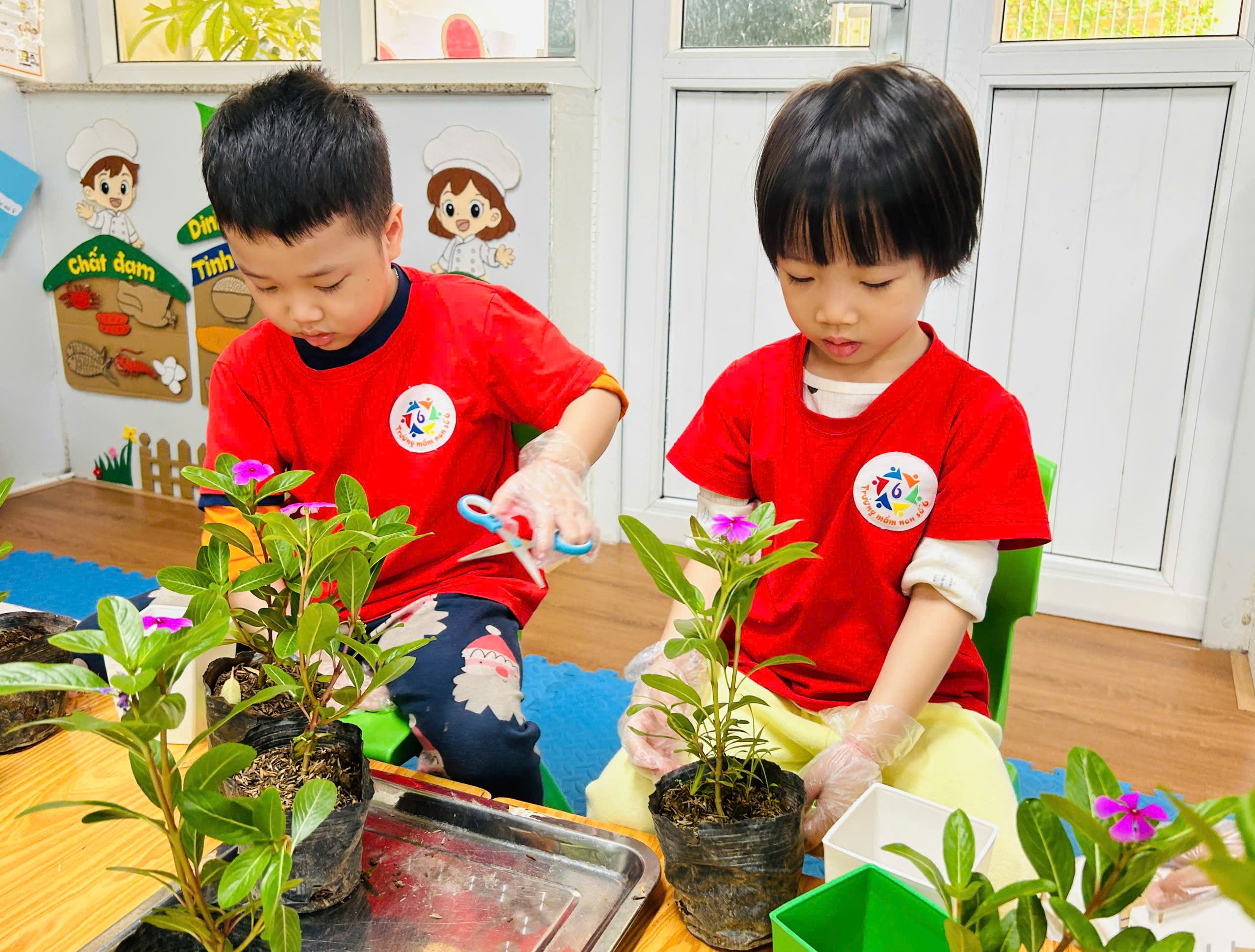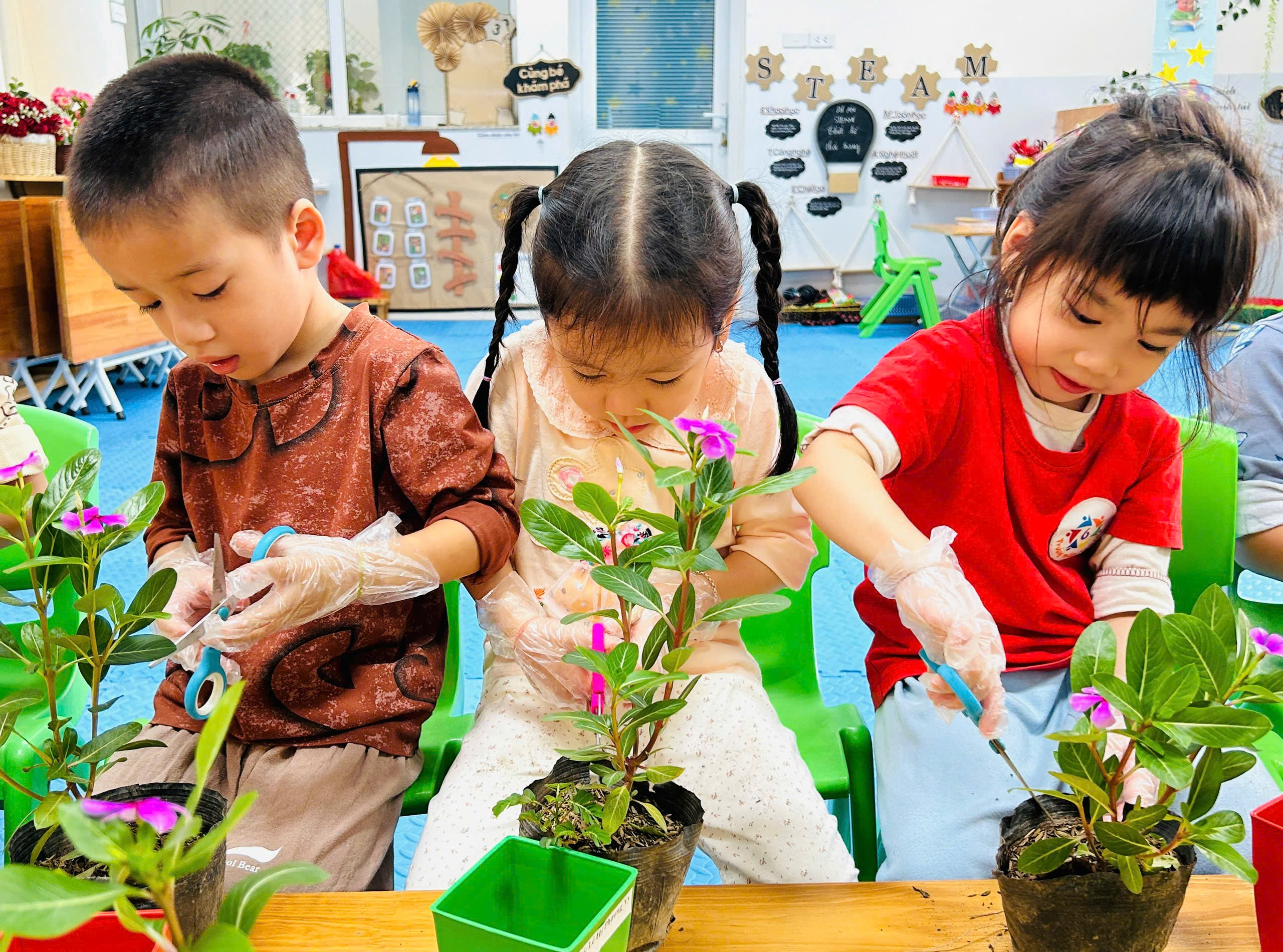 Trong buổi trải nghiệm, các bé được cô giáo giới thiệu về đặc điểm của cây hoa dừa cạn, cách chăm sóc và lợi ích của việc trồng cây xanh. Với sự hướng dẫn tận tình của cô, từng bạn nhỏ hào hứng tự tay xúc đất – đặt cây – lấp đất – tưới nước, chăm chút cho chậu hoa bé nhỏ của mình. Khuôn mặt bạn nào cũng rạng rỡ vì được “làm người làm vườn nhí”, tự tạo nên chậu hoa đặc biệt. Hoạt động không chỉ giúp trẻ phát triển kỹ năng vận động, khả năng quan sát, mà còn nuôi dưỡng tình yêu thiên nhiên, ý thức bảo vệ môi trường và đặc biệt là lòng biết ơn dành cho cô – những người đã luôn dạy dỗ và nâng bước các con mỗi ngày.