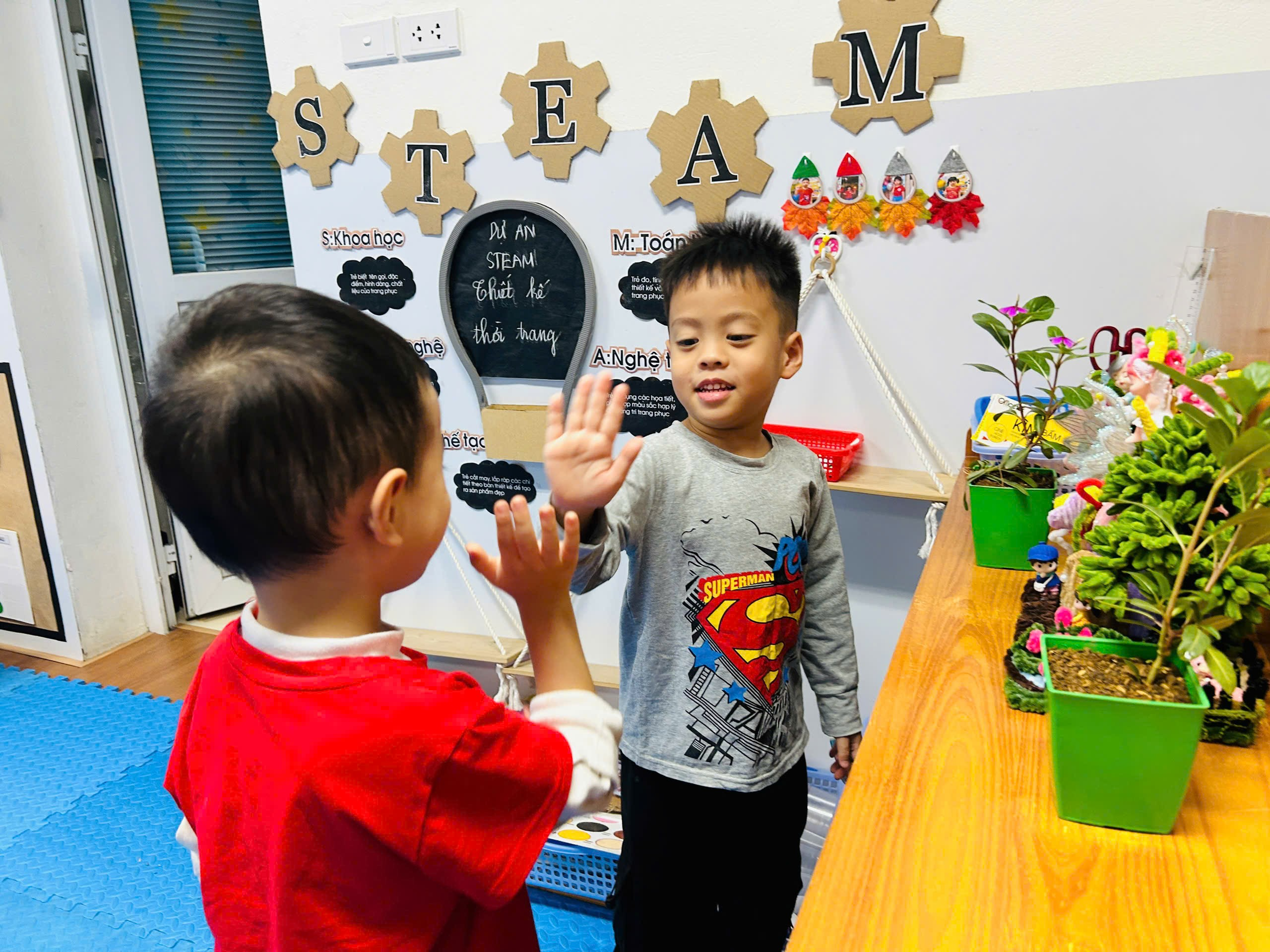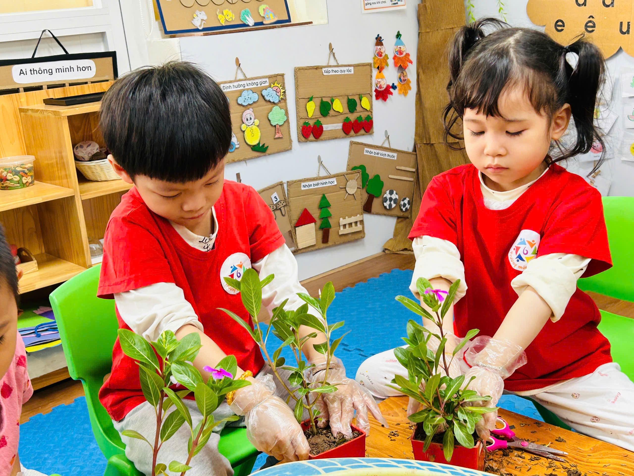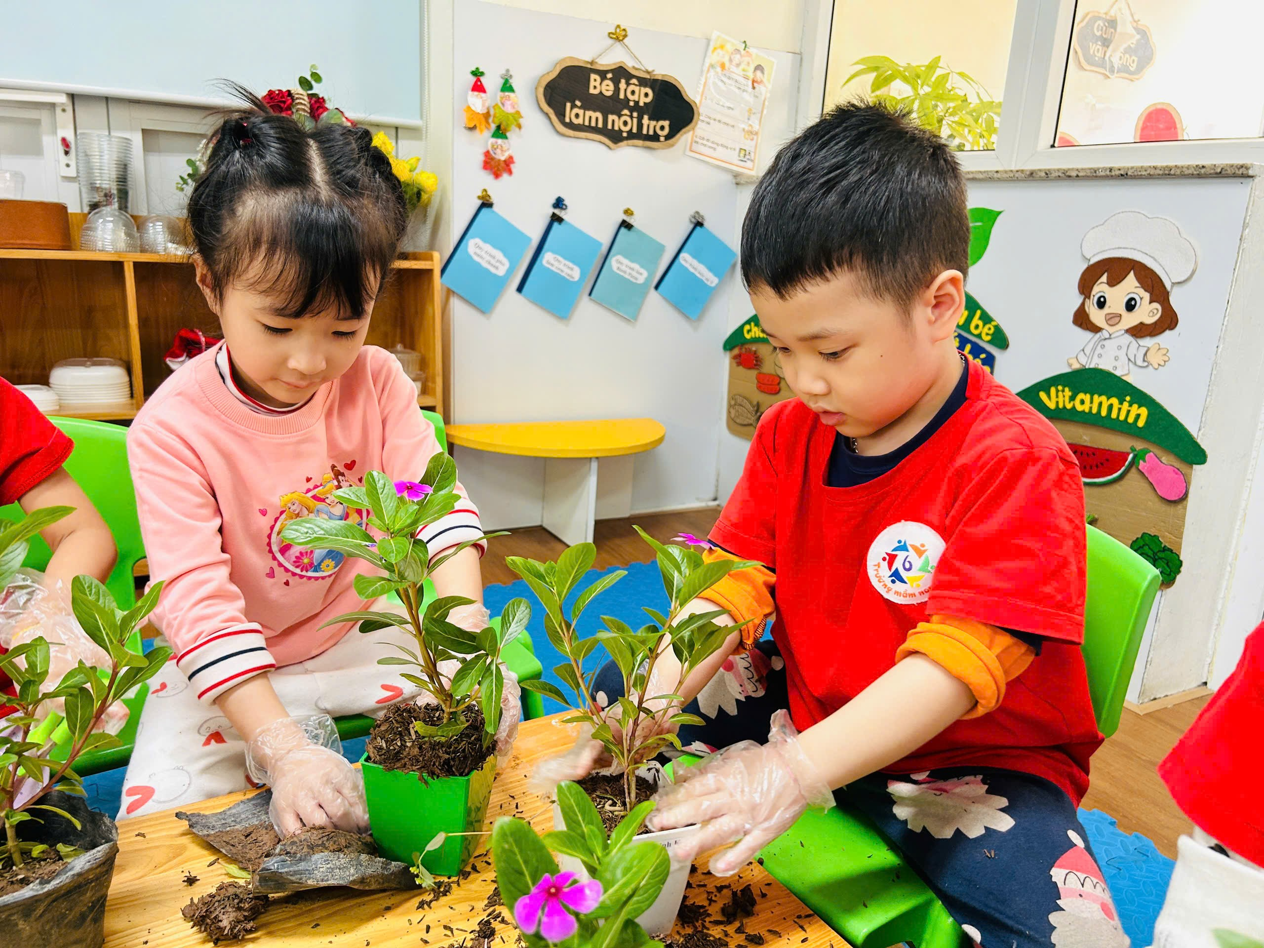 Trong buổi trải nghiệm, các bé được cô giáo giới thiệu về đặc điểm của cây hoa dừa cạn, cách chăm sóc và lợi ích của việc trồng cây xanh. Với sự hướng dẫn tận tình của cô, từng bạn nhỏ hào hứng tự tay xúc đất – đặt cây – lấp đất – tưới nước, chăm chút cho chậu hoa bé nhỏ của mình. Khuôn mặt bạn nào cũng rạng rỡ vì được “làm người làm vườn nhí”, tự tạo nên chậu hoa đặc biệt. Hoạt động không chỉ giúp trẻ phát triển kỹ năng vận động, khả năng quan sát, mà còn nuôi dưỡng tình yêu thiên nhiên, ý thức bảo vệ môi trường và đặc biệt là lòng biết ơn dành cho cô – những người đã luôn dạy dỗ và nâng bước các con mỗi ngày.