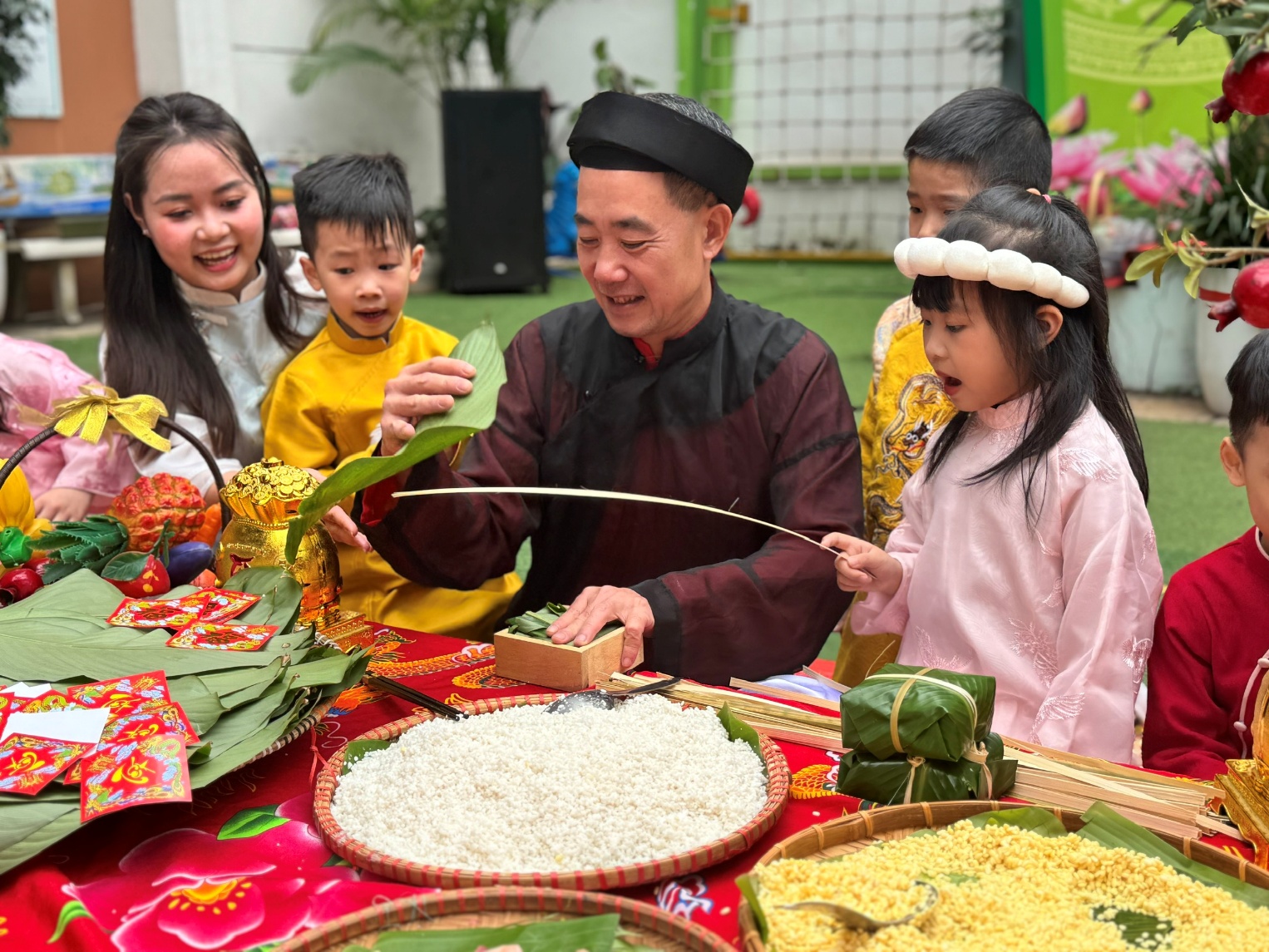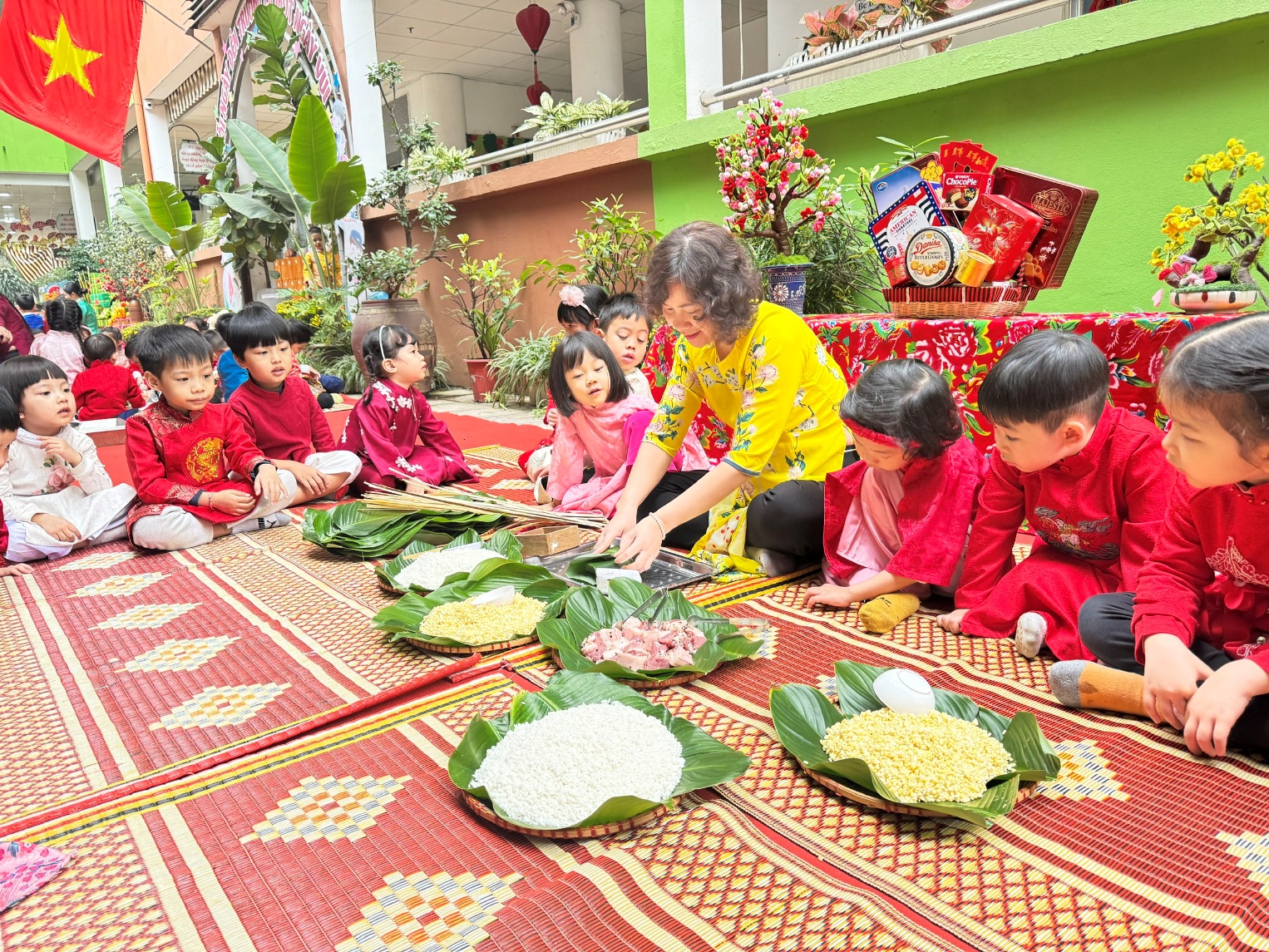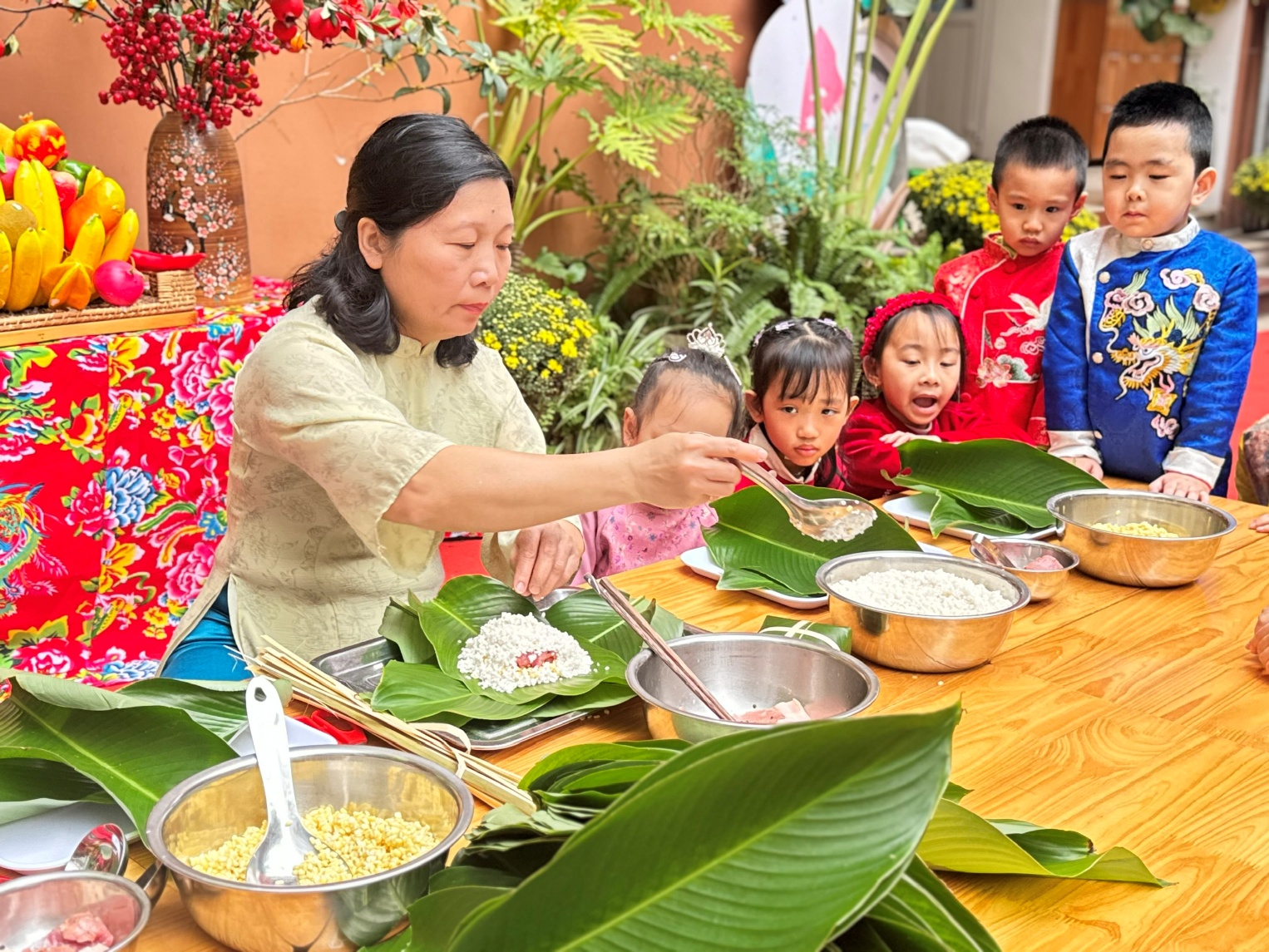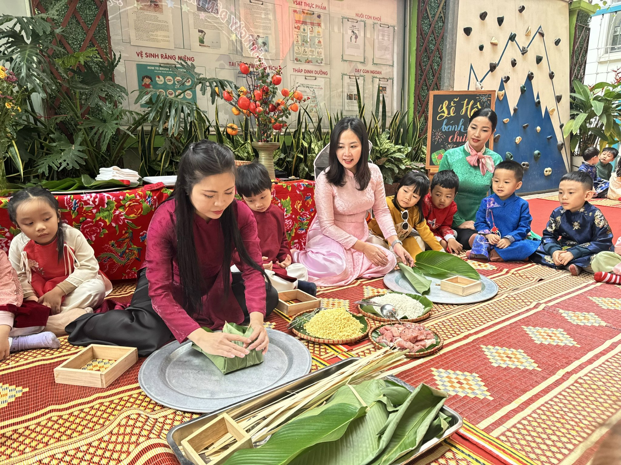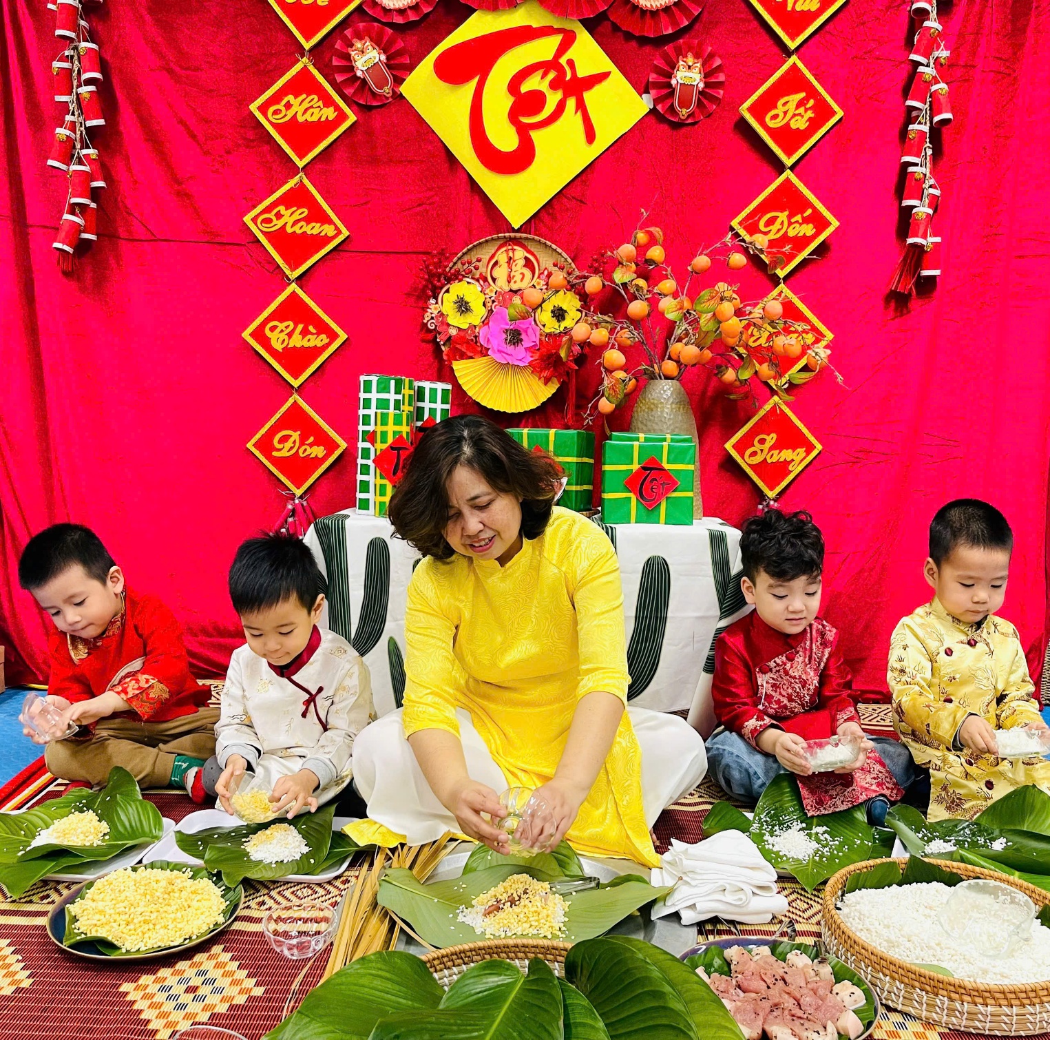 Được tham gia trải nghiệm gói bánh chưng, bé nào cũng hào hứng, chăm chú nghe cô giáo hướng dẫn, xem cô làm mẫu. Trẻ được quan sát cách xếp lá, cách lấy gạo và đỗ xanh như nào để khéo léo gói những chiếc bánh chưng cho riêng mình. Hơn nữa, trẻ hiểu thêm về giá trị của chiếc bánh, nó thể hiện tình yêu thương của gia đình. Nhân đỗ tượng trưng cho những đứa con thơ; gạo nếp, lá dong được ví như bố mẹ luôn bao bọc che chở lấy các con. Và tình cảm ấy càng bền chặt hơn qua những sợi dây lạt buộc phía bên ngoài.
