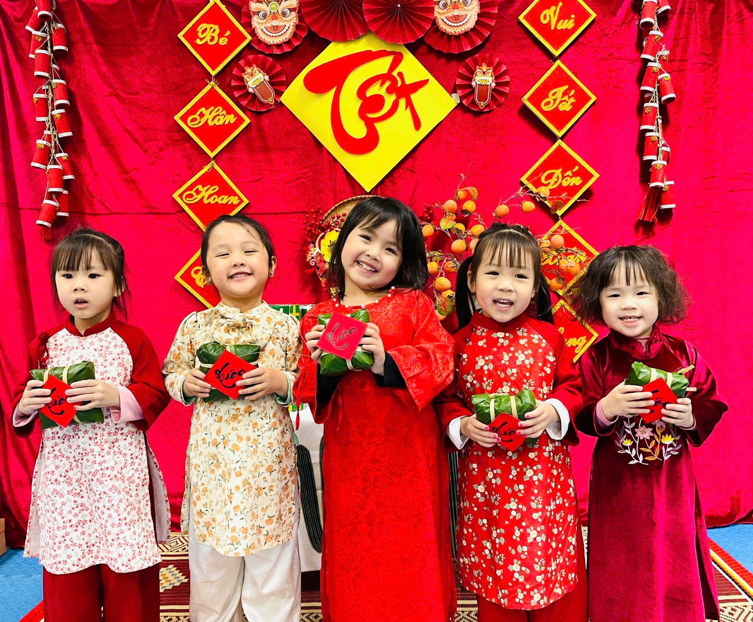 Ngay từ sáng sớm, các nguyên liệu đã được chia đều và sắp xếp thật ngay ngắn vào các khay. Từng góc lớp cũng được giáo viên trang trí rộn ràng sắc xuân. Cô trò tíu tít trong trang phục áo dài truyền thống. Tất cả tạo nên một Lễ hội bánh chưng xanh thật vui vẻ và đầm ấm tại Trường Mầm non Số 6.