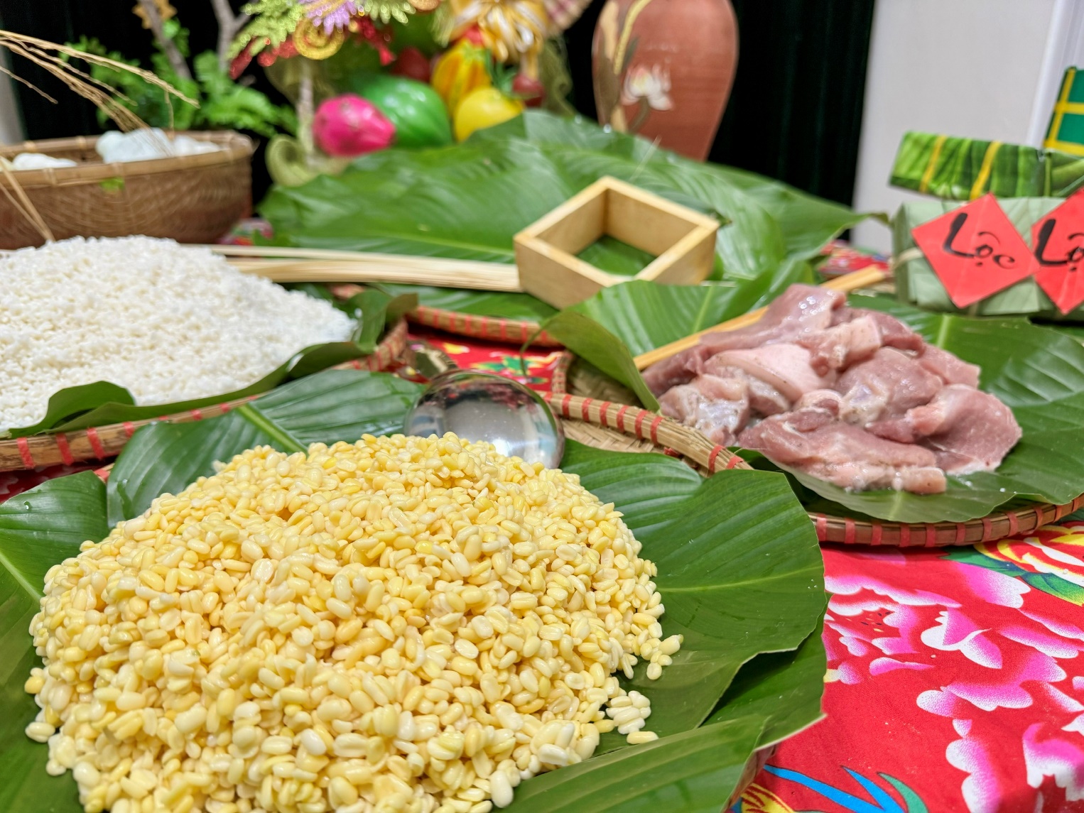 Để chuẩn bị cho Lễ hội Bánh chưng xanh, các cô bác tổ nuôi dưỡng đã lựa chọn những loại nguyên liệu ngon nhất: gạo nếp, đỗ xanh, thịt ba chỉ… và những mớ lá dong thật tươi, những bó lạt mềm mại được rửa thật sạch, để ráo nước, sẵn sàng cho hoạt động trải nghiệm gói bánh chưng của các con.