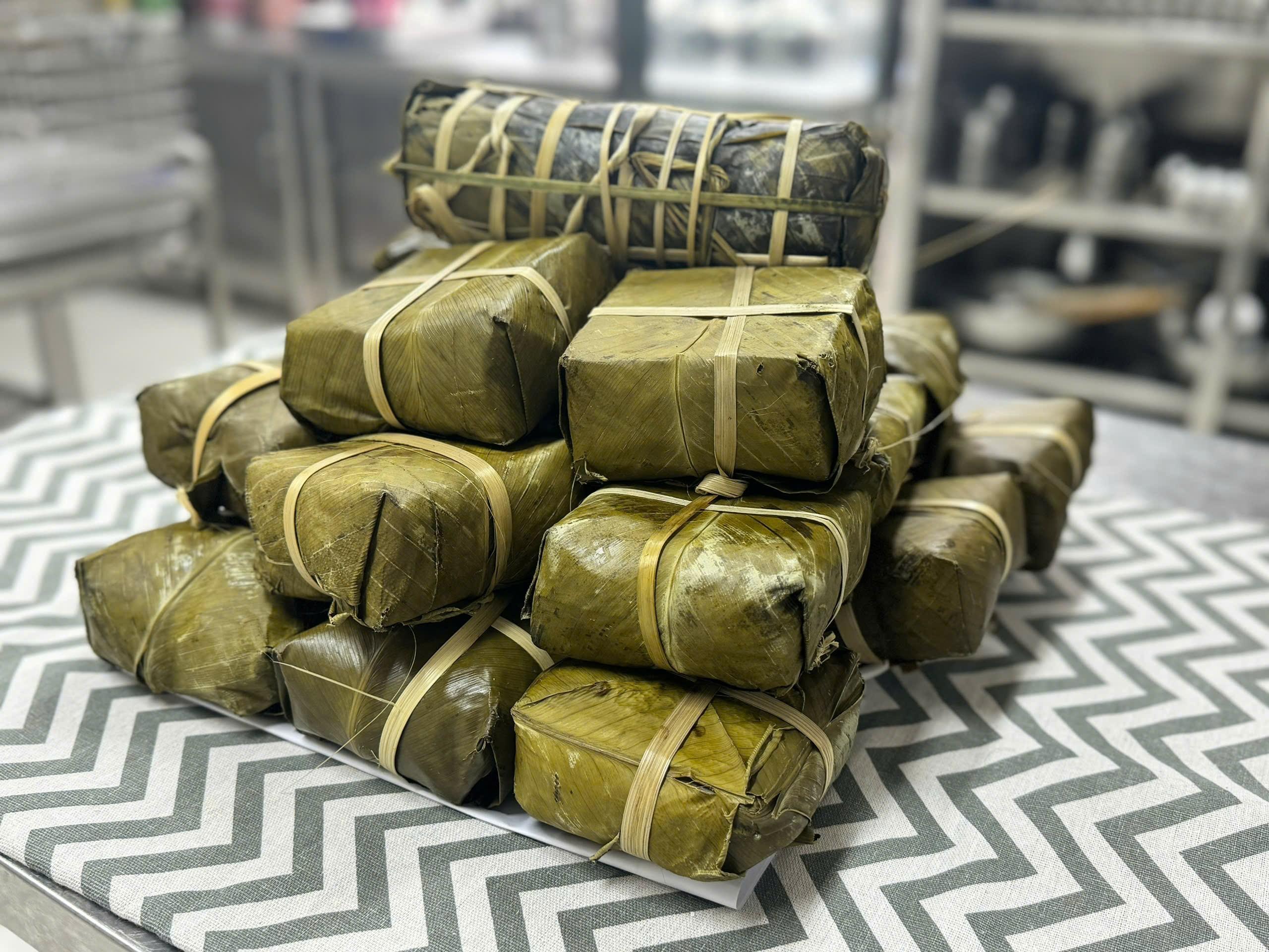 Các nguyên liệu gói bánh chưng đã được sắp xếp thật đẹp mắt trên các mẹt lá.
