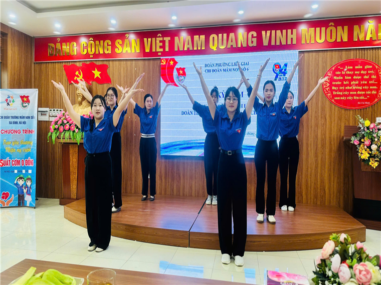 Để hưởng ứng tháng thanh niên và kỷ niệm 94 năm ngày thành lập Đoàn thanh niên Cộng sản Hồ Chí Minh, Đoàn Thanh niên Trường Mầm non số 6 đã xây dựng kế hoạch và phát động các phong trào, hoạt động hết sức thiết thực như: Hiến máu tình nguyện (8-10 đ/c) và Chương trình “Trao yêu thương_Nhận nụ cười”. Với chương trình “Trao yêu thương_Nhận nụ cười” chi Đoàn đã Vận động cán bộ giáo viên nhân viên và phụ huynh học sinh ủng hộ xuất cơm 0 đồng với tổng số tiền quyên góp được là: 16.106.000đ (Trong đó ủng hộ 300 xuất cơm 0 đồng tại viện nhi Trung ương trị giá 9.000.000đ và ủng hộ sữa, bỉm cho trẻ em và người già tại trung tâm bảo trợ Xã hội 3: trị giá 7.106.000đ và bánh kẹo…).