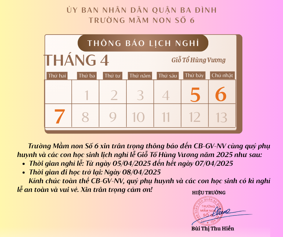 Trường Mầm non Số 6 xin trân trọng thông báo đến CB-GV-NV cùng quý phụ huynh và các con học sinh lịch nghỉ lễ Giỗ Tổ Hùng Vương năm 2025 như sau: