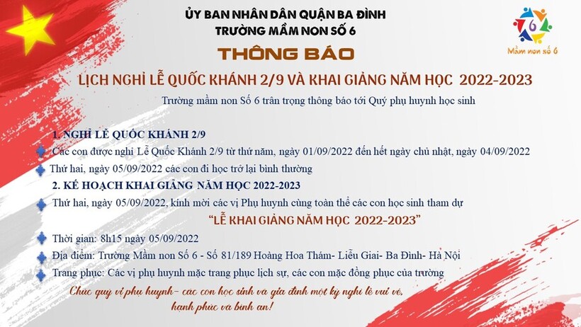 Ban giám hiệu trường mầm non Số 6 xin gửi tới các vị phụ huynh thông báo về lịch nghỉ lễ Quốc khánh 2/9 và Khai giảng năm học 2022- 2023.