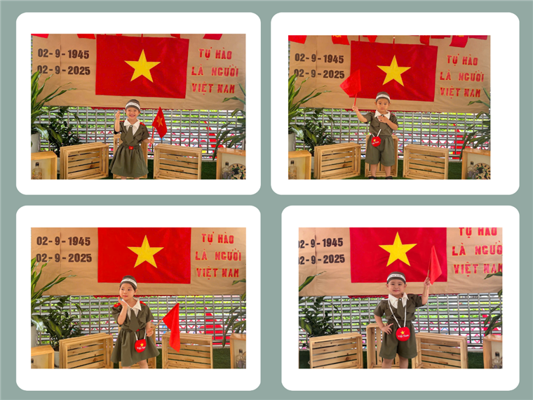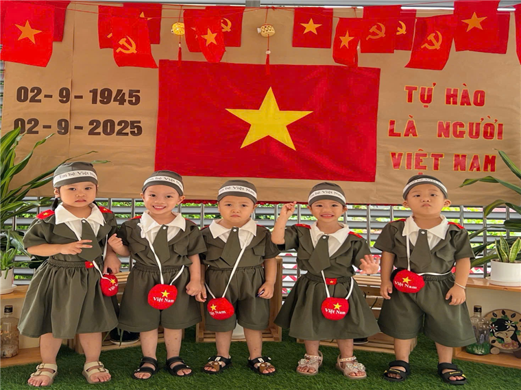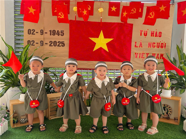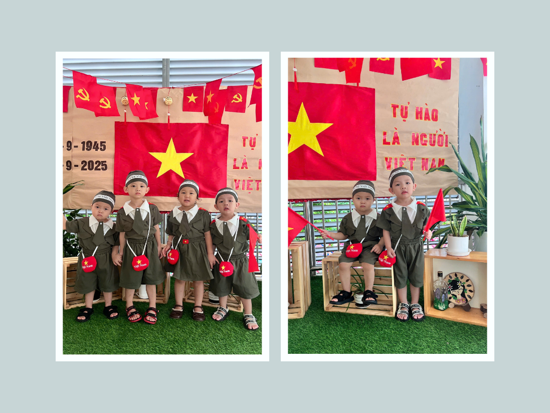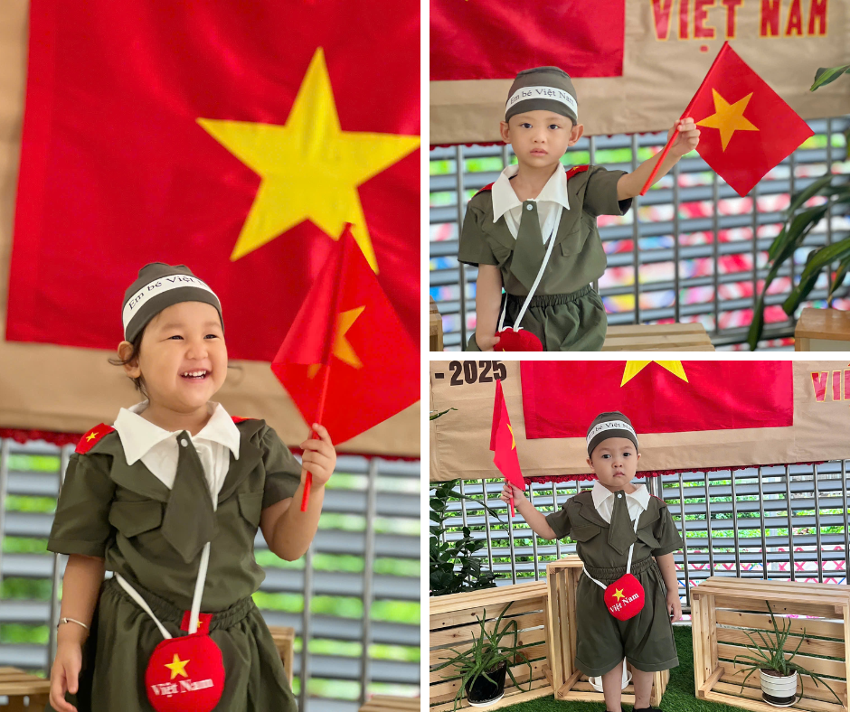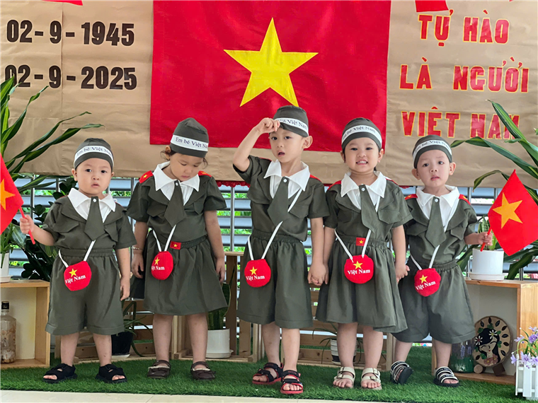 Hòa chung không khí tưng bừng của cả nước, các bé lớp Mẫu giáo bé C2 đã có hoạt động trải nghiệm vô cùng ý nghĩa để chào mừng kỷ niệm 80 năm Quốc khánh Việt Nam 2/9.Trong sắc phục xanh của “những chiến sĩ tí hon”, các con đã cùng giương cao lá cờ đỏ sao vàng và thể hiện niềm tự hào khi được là con cháu của dân tộc Việt Nam anh hùng.