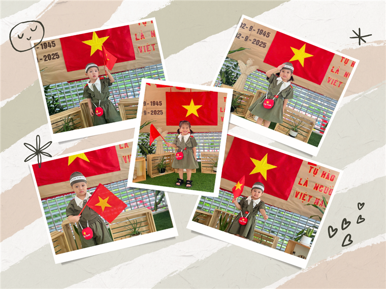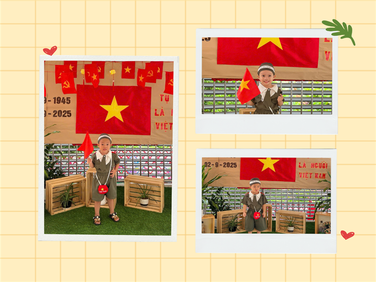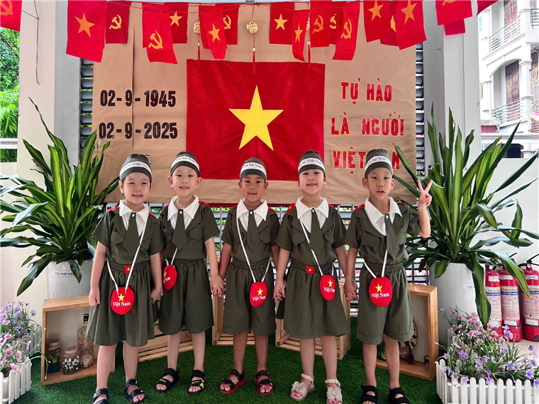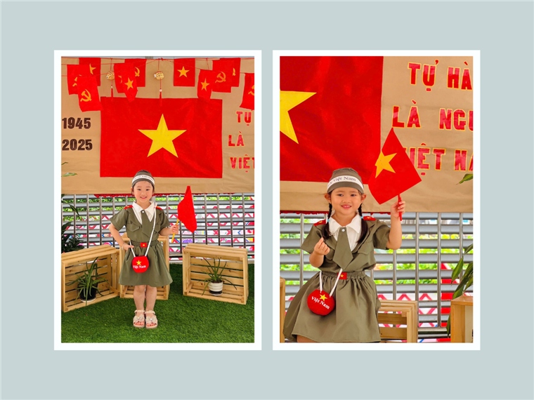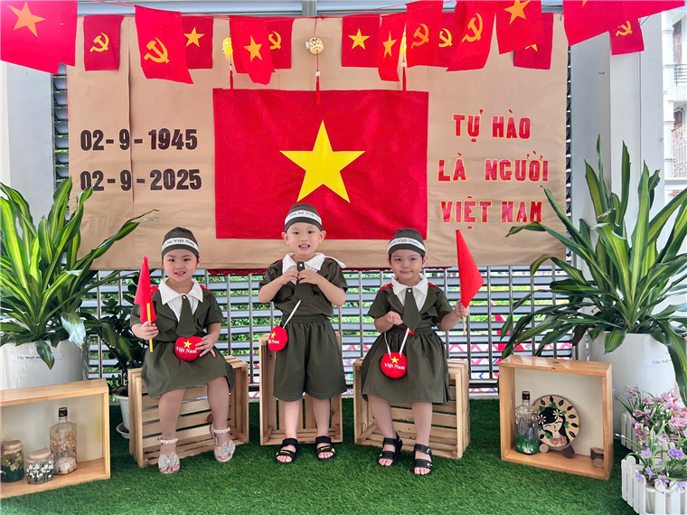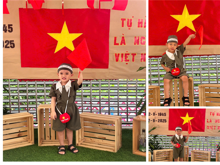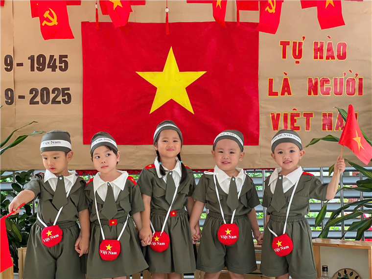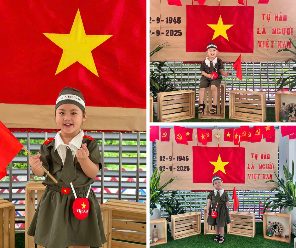 Hòa chung không khí tưng bừng của cả nước, các bé lớp Mẫu giáo bé C2 đã có hoạt động trải nghiệm vô cùng ý nghĩa để chào mừng kỷ niệm 80 năm Quốc khánh Việt Nam 2/9.Trong sắc phục xanh của “những chiến sĩ tí hon”, các con đã cùng giương cao lá cờ đỏ sao vàng và thể hiện niềm tự hào khi được là con cháu của dân tộc Việt Nam anh hùng.