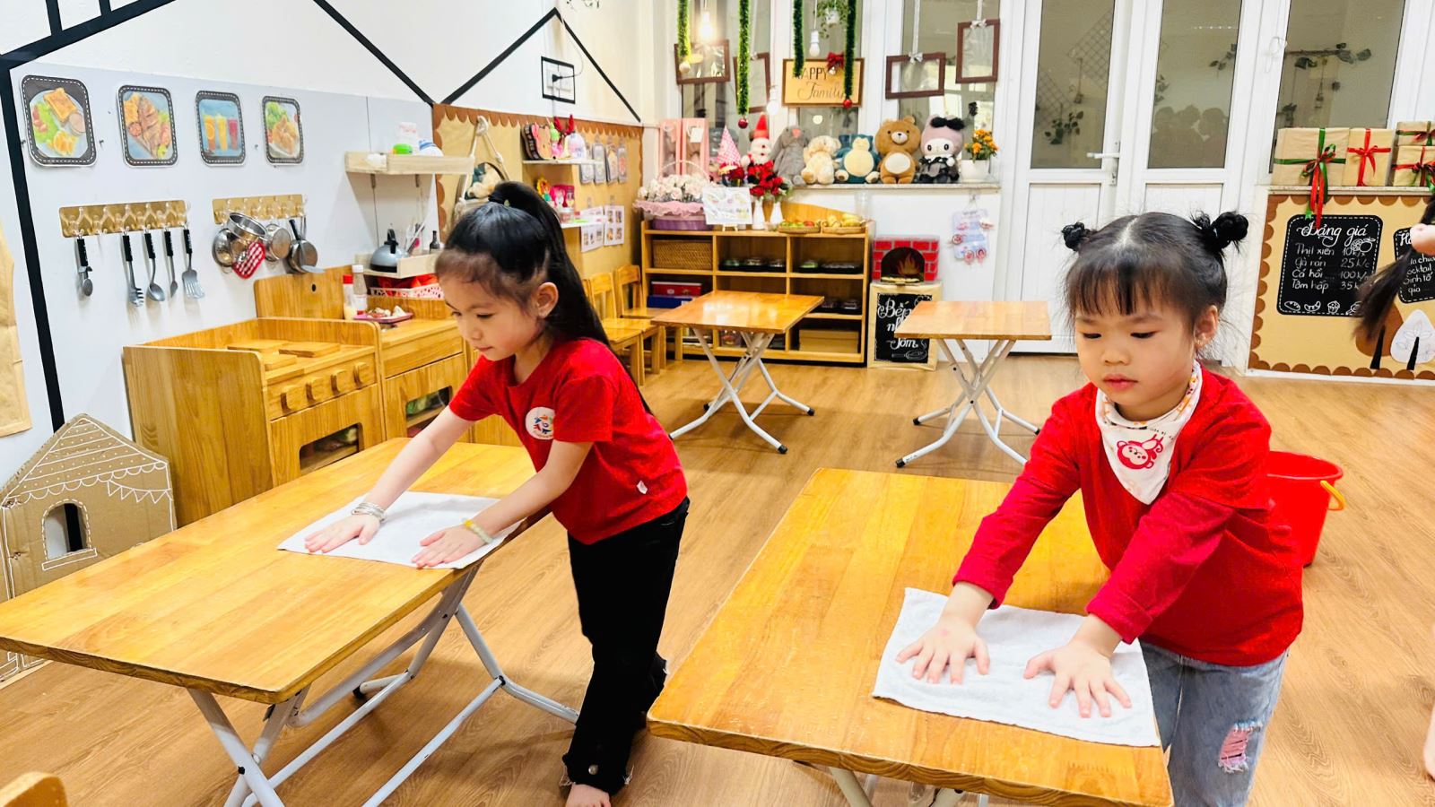 Các bạn gái trực nhật giúp cô lau bàn ăn sạch sẽ, đúng kỹ năng