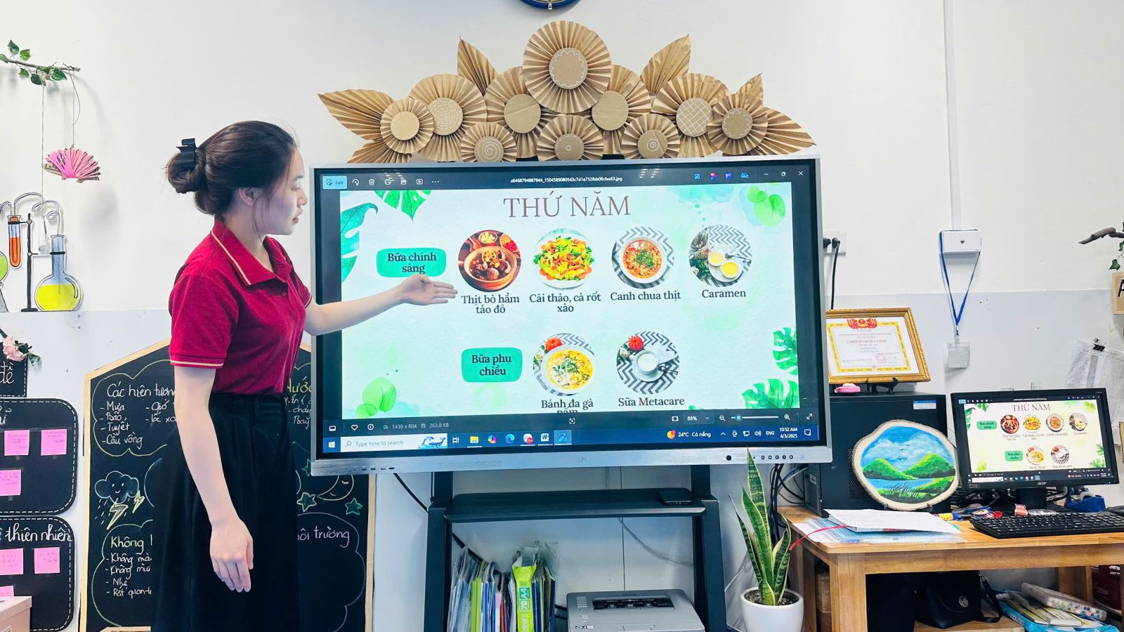 Cô giáo giới thiệu các món ăn trong thực đơn bữa trưa, tạo tâm thế vui vẻ, hào hứng trước khi ăn
