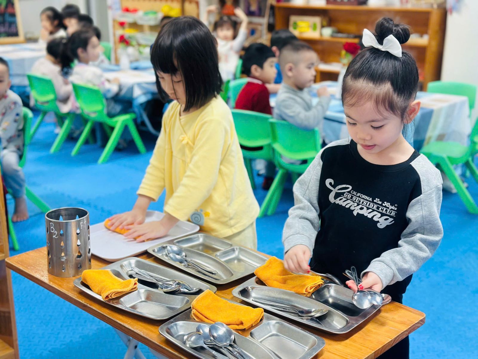 Kỹ năng gấp khăn lau tay, chia thìa cũng được các bạn trực nhật thực hiện một cách thuần thục