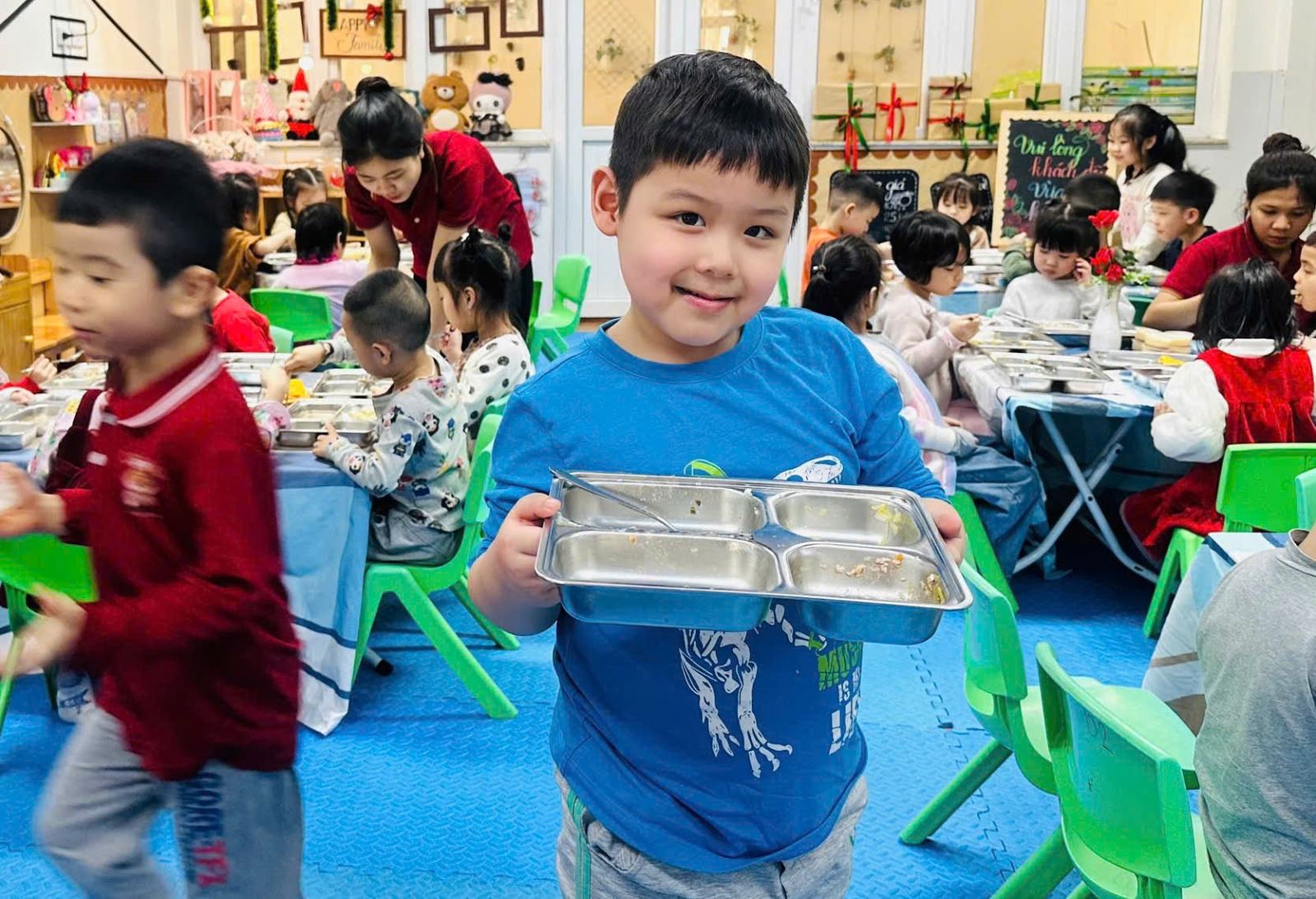 Các bé đều chăm chú, thích thú khi nghe cô giáo giới thiệu về các món ăn trong thực đơn. Cùng với đó là nụ cười hớn hở khi nhìn các bạn trong lớp lần lượt bê khay thức ăn của mình về bàn và cùng ngắm nghía, trao đổi một chút ban đầu về khay cơm của mình. Tất cả tạo nên bầu không khí thân thiện, hào hứng của các bé khi ăn giúp đem lại những cảm xúc tích cực cho trẻ.