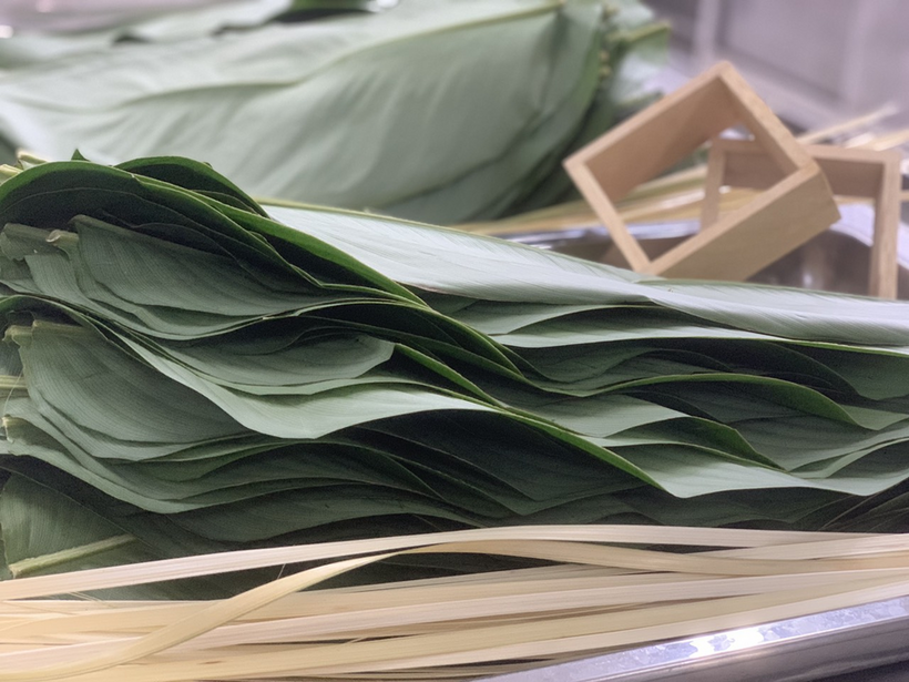 Lá dong và lạt đã được các cô và trẻ rửa sạch và lau khô