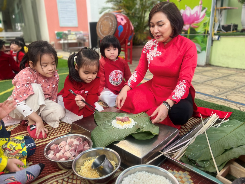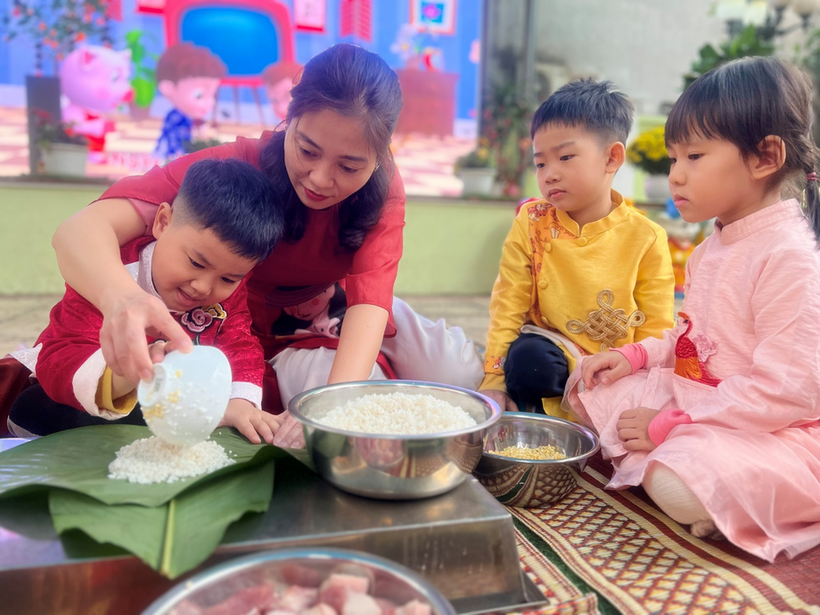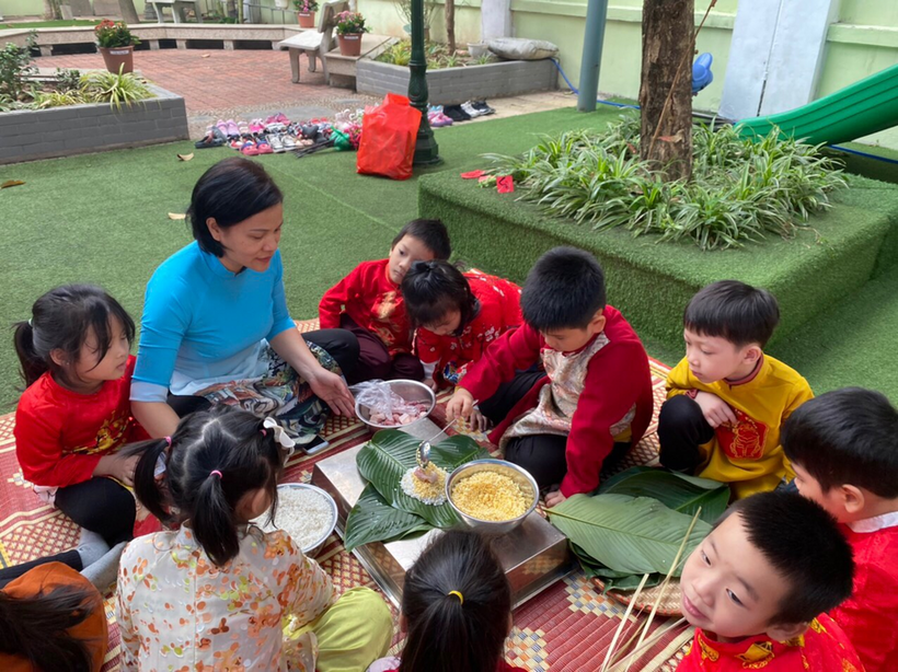 Trẻ được quan sát các cô hướng dẫn xếp lá, cho nguyên liệu để gói những chiếc bánh chưng cho riêng mình. Hơn nữa, trẻ hiểu hơn về giá trị của chiếc bánh, nó thể hiện tình yêu thương của gia đình. Nhân đỗ tượng trưng cho những đứa con thơ; gạo nếp, lá dong được ví như bố mẹ luôn bao bọc che chở lấy các con. Và tình cảm ấy càng bền chặt hơn qua những sợi dây lạt buộc phía bên ngoài.
