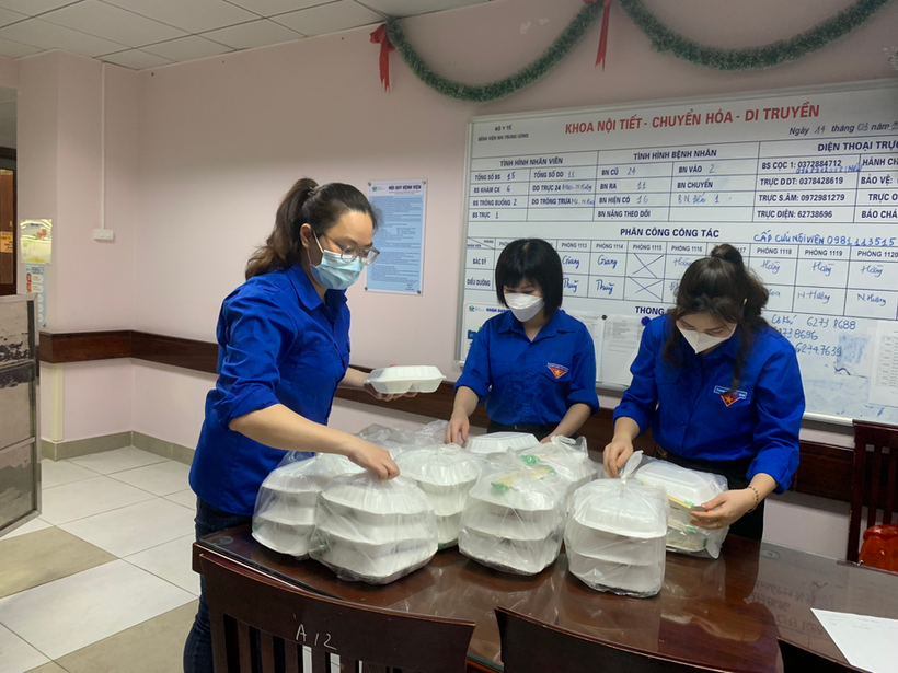 Các đoàn viên đang chuẩn bị trao những suất cơm
