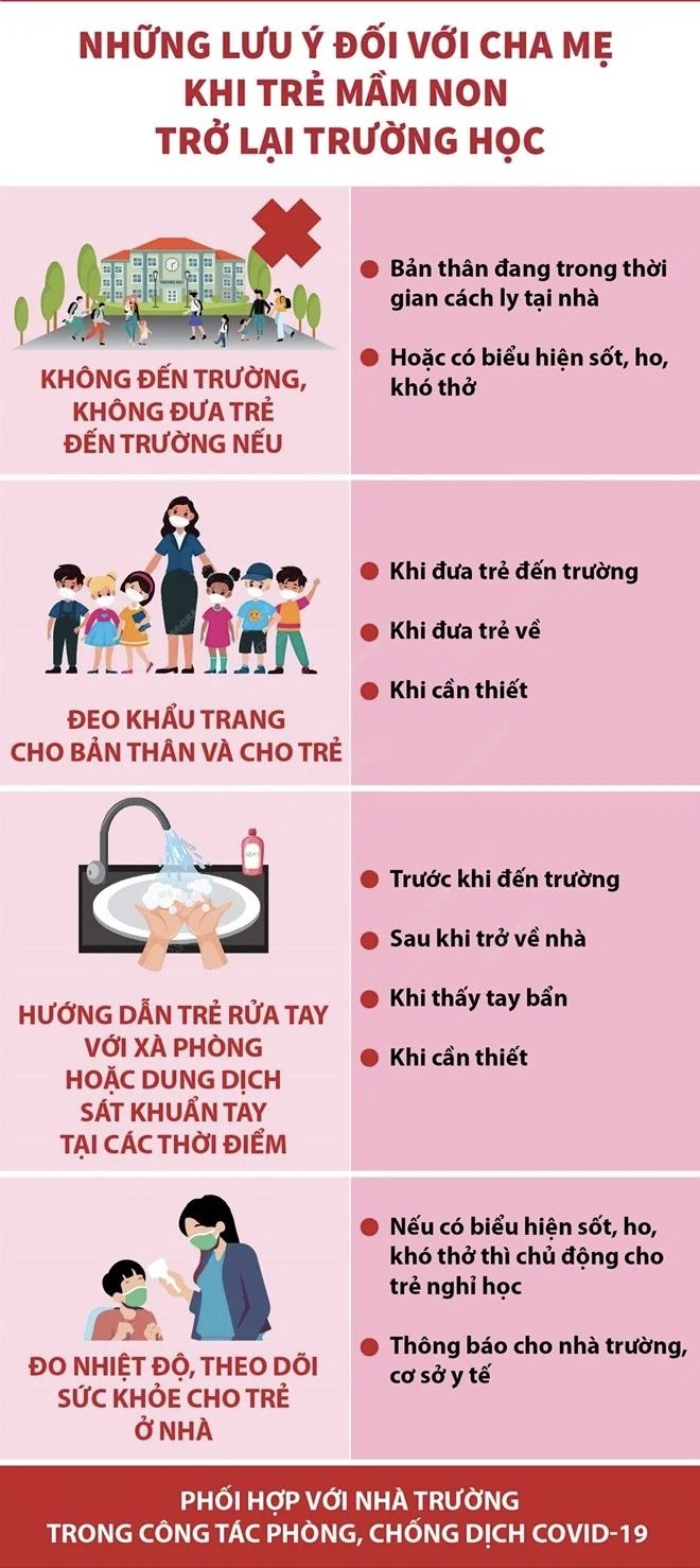 Cha mẹ học sinh tại trường mầm non không đến trường, không đưa trẻ đến trường nếu bản thân đang trong thời gian cách ly tại nhà hoặc có biểu hiện sốt, ho, khó thở. Đồng thời, cần đeo khẩu trang cho mình và cho trẻ, hướng dẫn trẻ rửa tay với xà phòng, đo nhiệt độ, theo dõi sức khỏe cho trẻ ở nhà./.