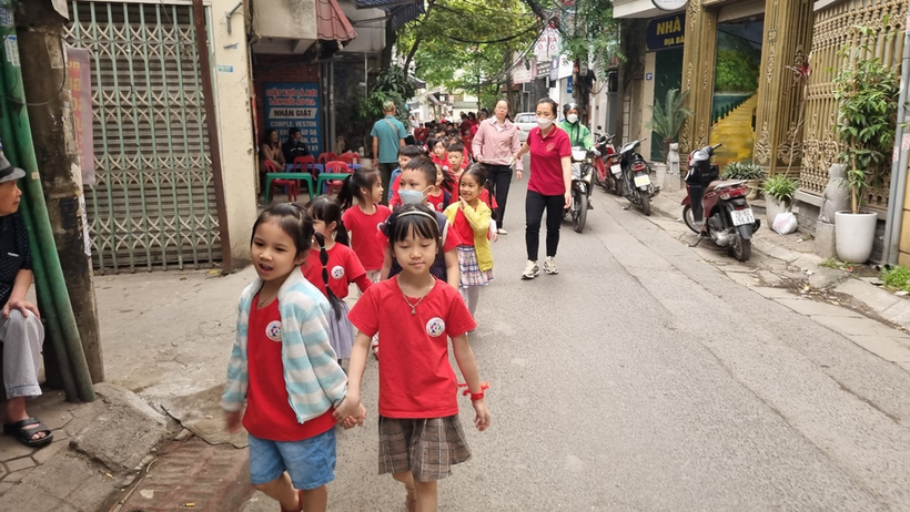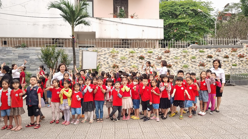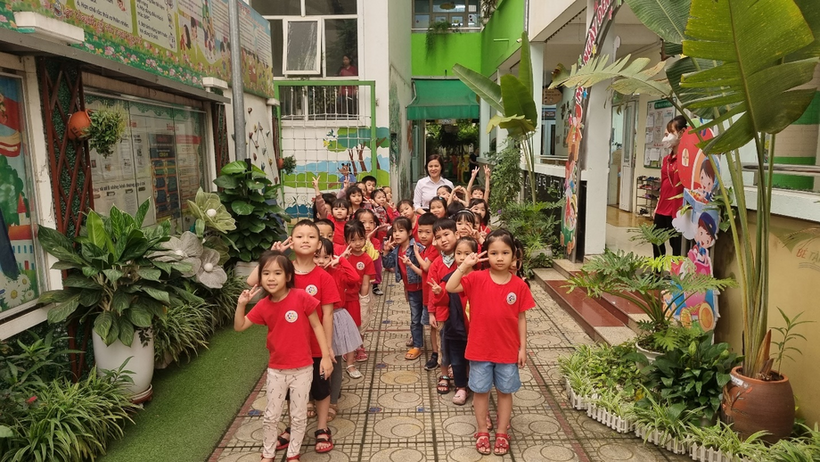 Các em nhỏ còn đang lạ lẫm, háo hức ngắm nhìn sân trường và các lớp học.