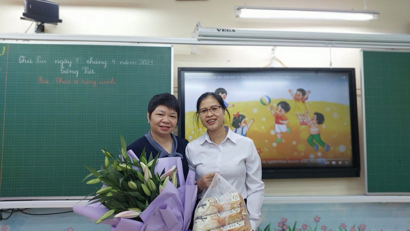 Cô Hiền thay mặt các con gửi bó hoa tươi thắm đến cô giáo trường tiểu học Ba Đình và những món quà đến các anh chị học sinh lớp 1.