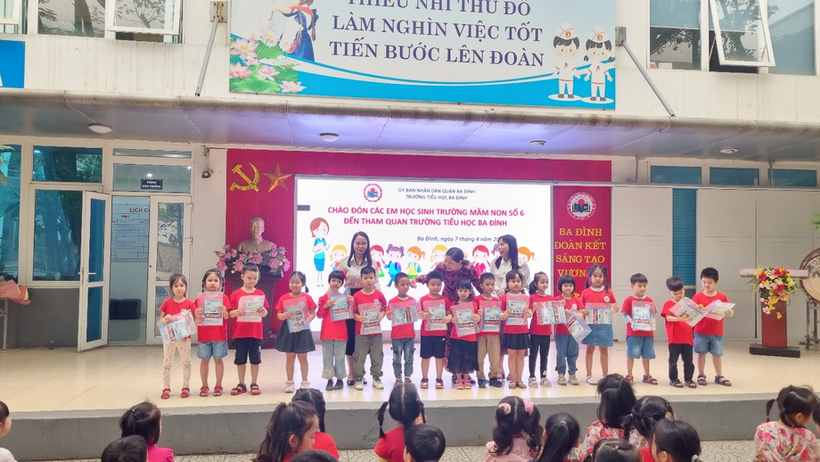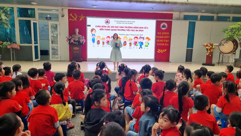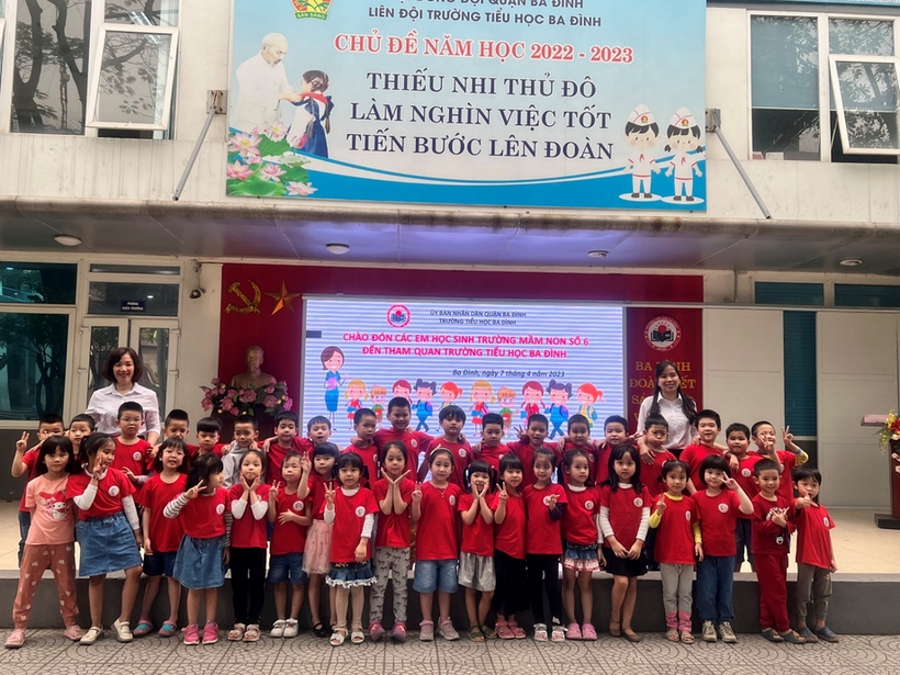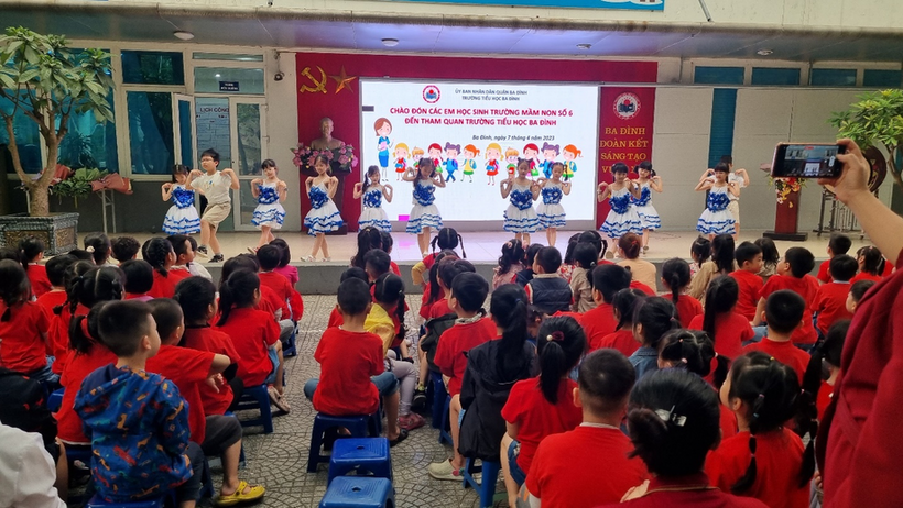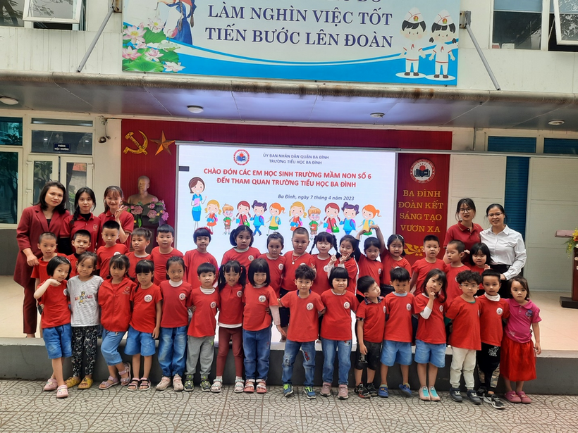 Khi được các cô giáo đưa sang trường, cảm nhận đầu tiên của các bé về ngôi trường Tiểu học Ba Đình là khoảng sân trường rộng rãi, nhiều cây xanh bóng mát. Trên sân khấu các cô giáo đã chuẩn bị sẵn dòng chữ: “Chào đón các em học sinh trường mầm non Số 6 đến thăm quan trường tiểu học ba Đình”. Các bác trong BGH và các cô giáo trường tiểu học Ba Đình cũng trìu mến chào đón các con. Các anh chị đón các em bằng những tiết mục văn nghệ vô cùng đặc sắc. Không khí giao lưu vô cùng ấm áp, gần gũi.