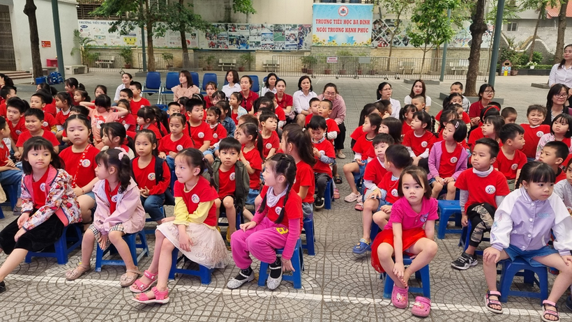 Các bác ban giám hiệu trường tiểu học Ba Đình trao quà tặng lưu niệm cho các em nhỏ.