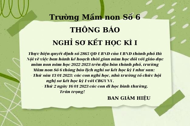 Thực hiện quyết định số 2865/QĐ-UBND của UBND thành phố Hà Nội về việc ban hành kế hoạch thời gian năm học đối với giáo dục mầm non năm học 2022-2023 trên địa bàn thành phố, trường Mầm non Số 6 thông báo lịch nghỉ sơ kết học kỳ I như sau: