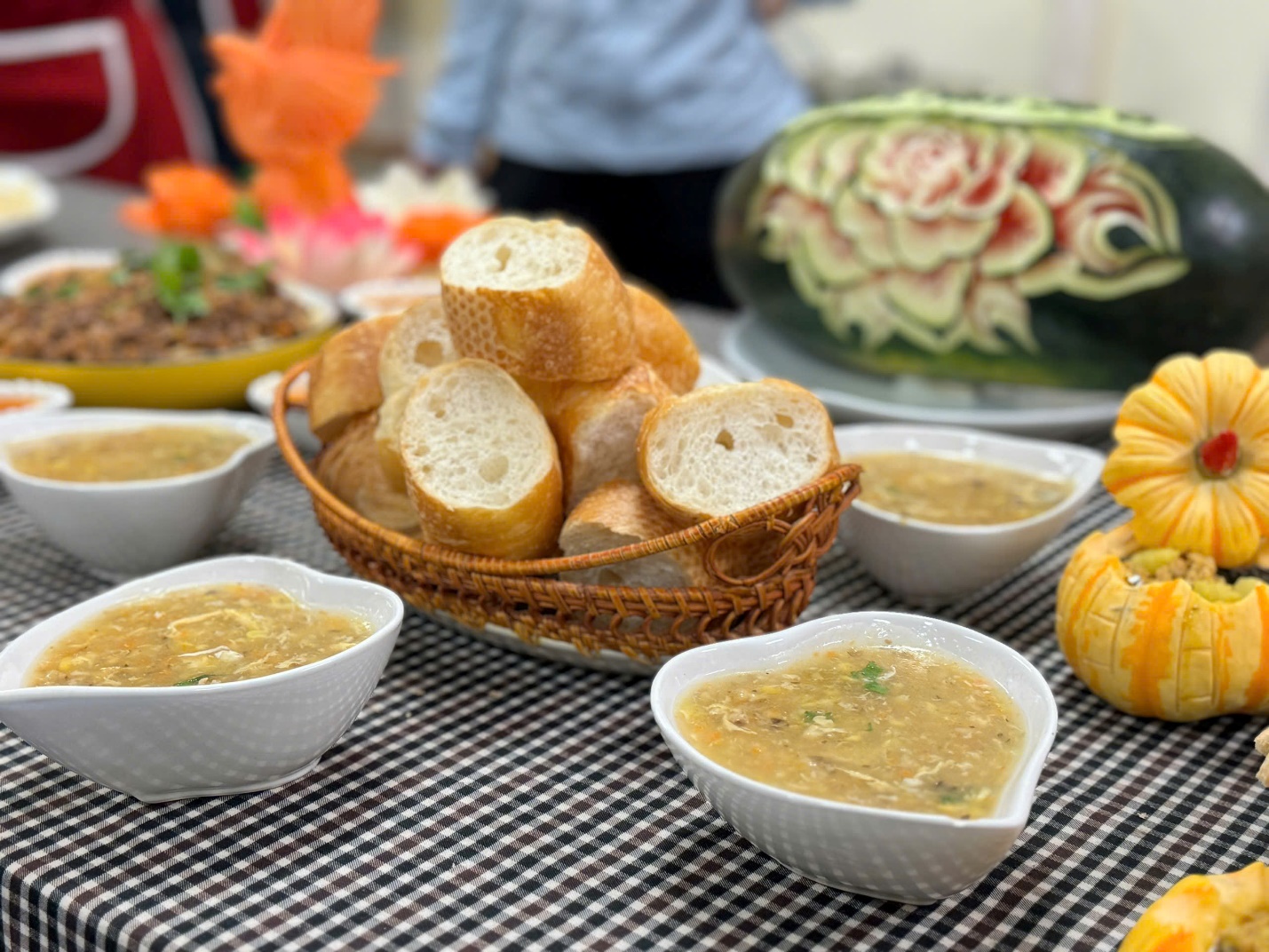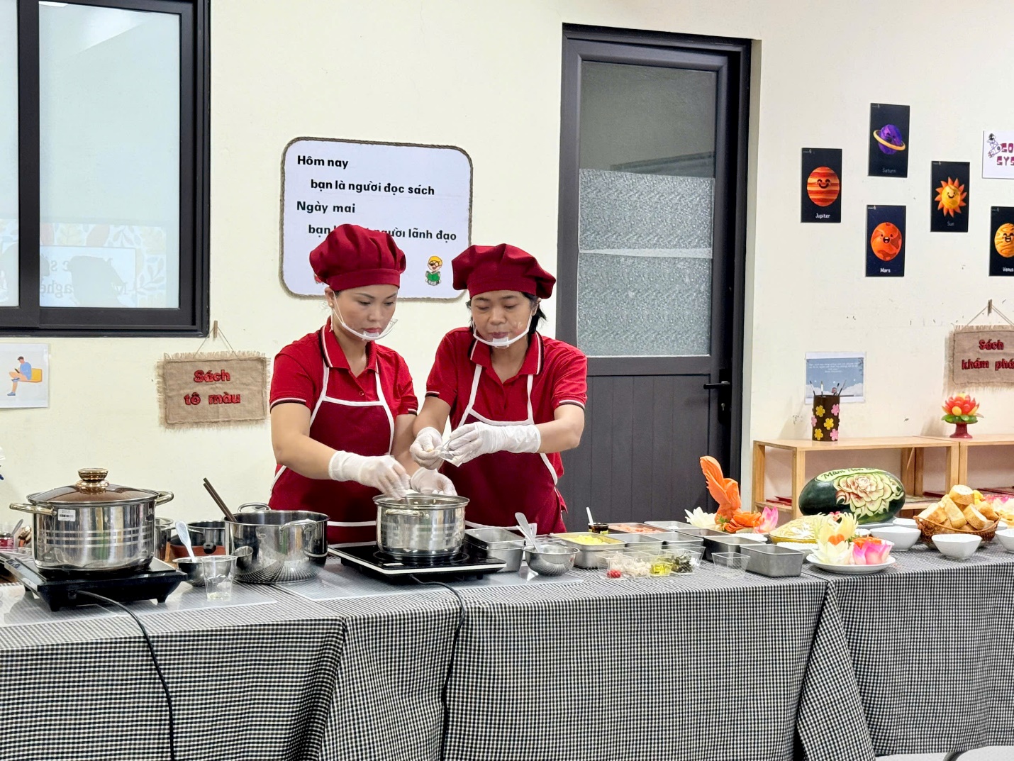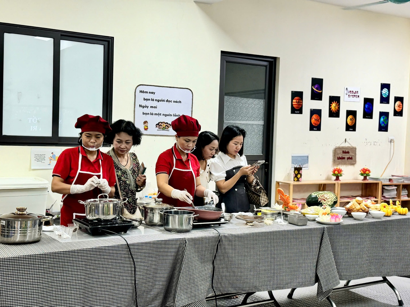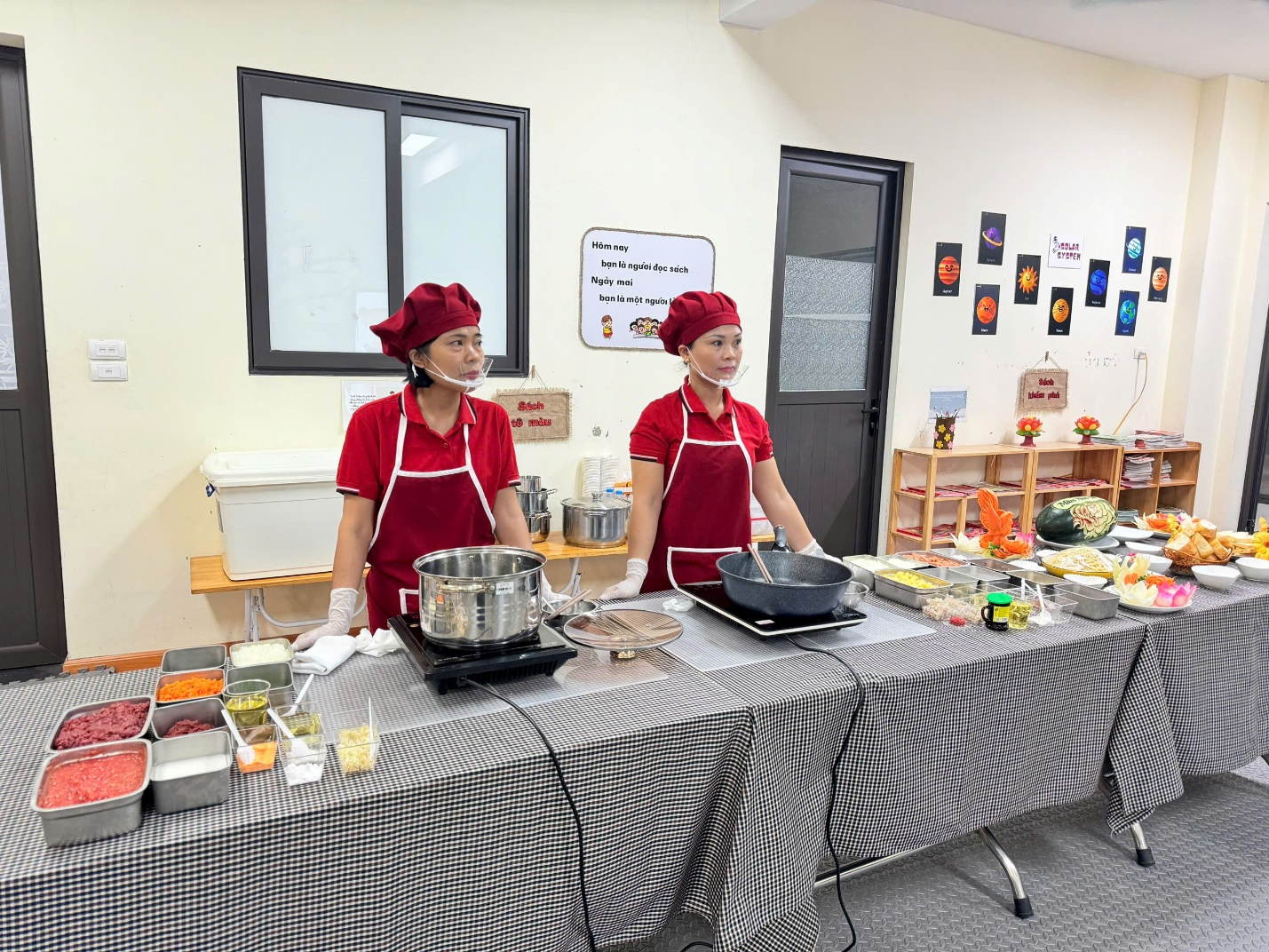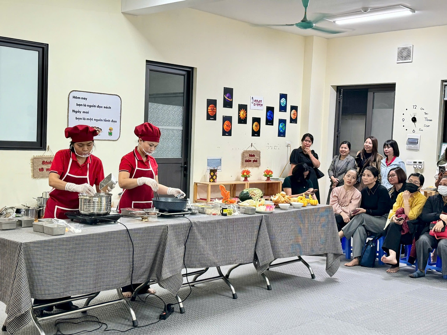 Sau từng bước thực hành, hai nhân viên nuôi dưỡng của Nhà trường cũng đã hoàn thành phần chia sẻ của mình. Các món ăn vừa có hương vị thơm ngon, màu sắc hài hòa của các loại thực phẩm tạo nên một tổng thể bữa ăn bắt mắt, hấp dẫn người thưởng thức.