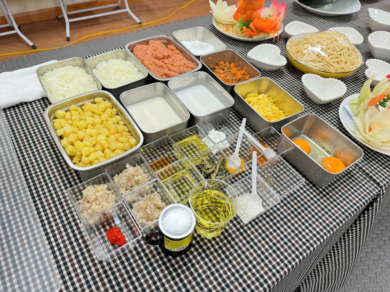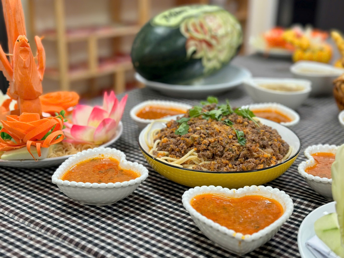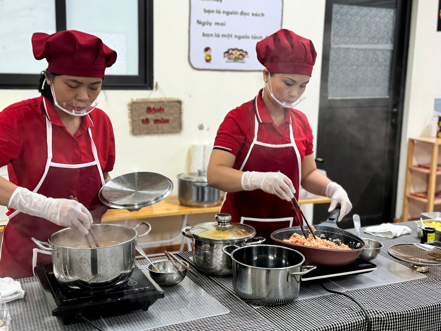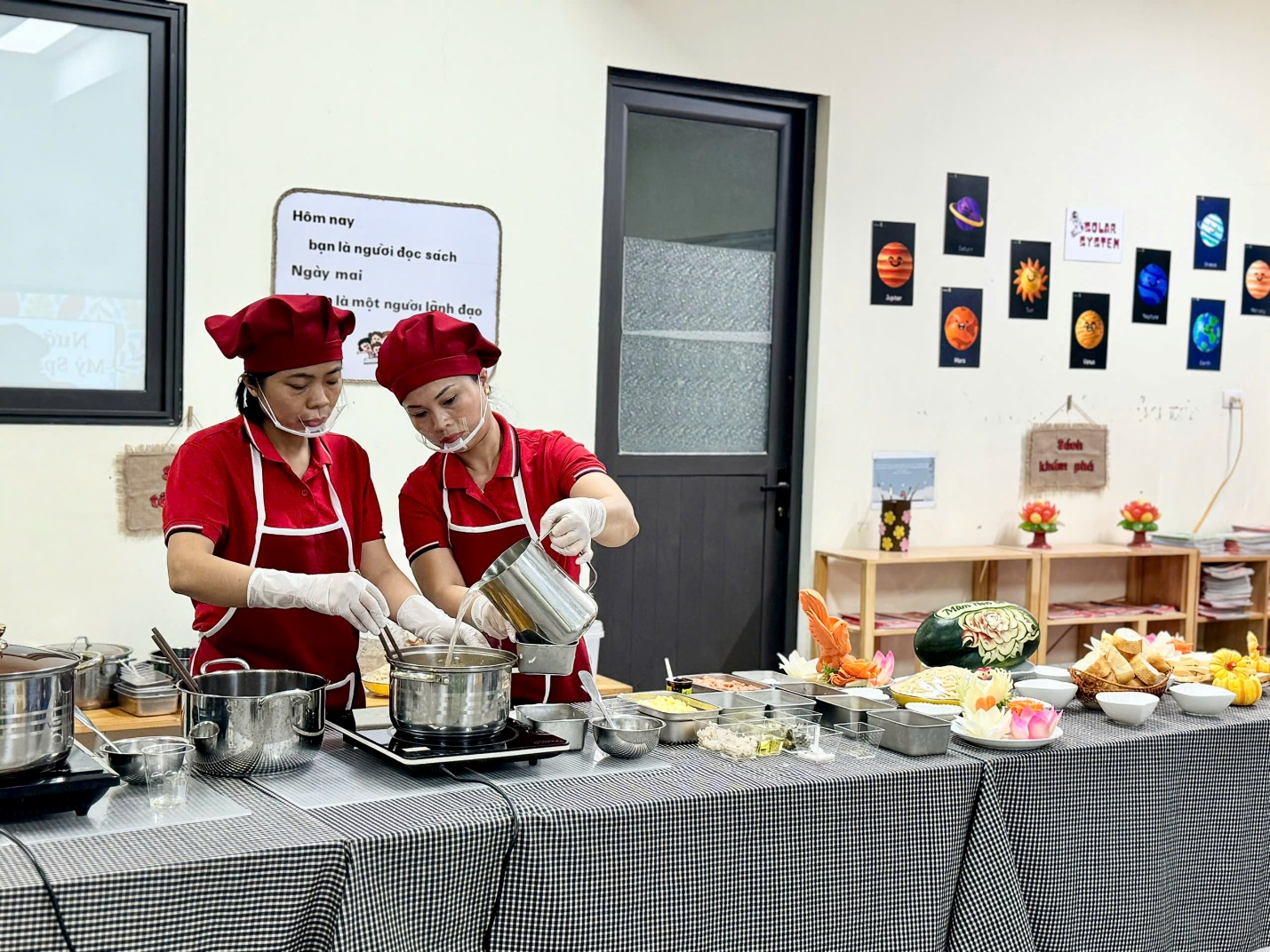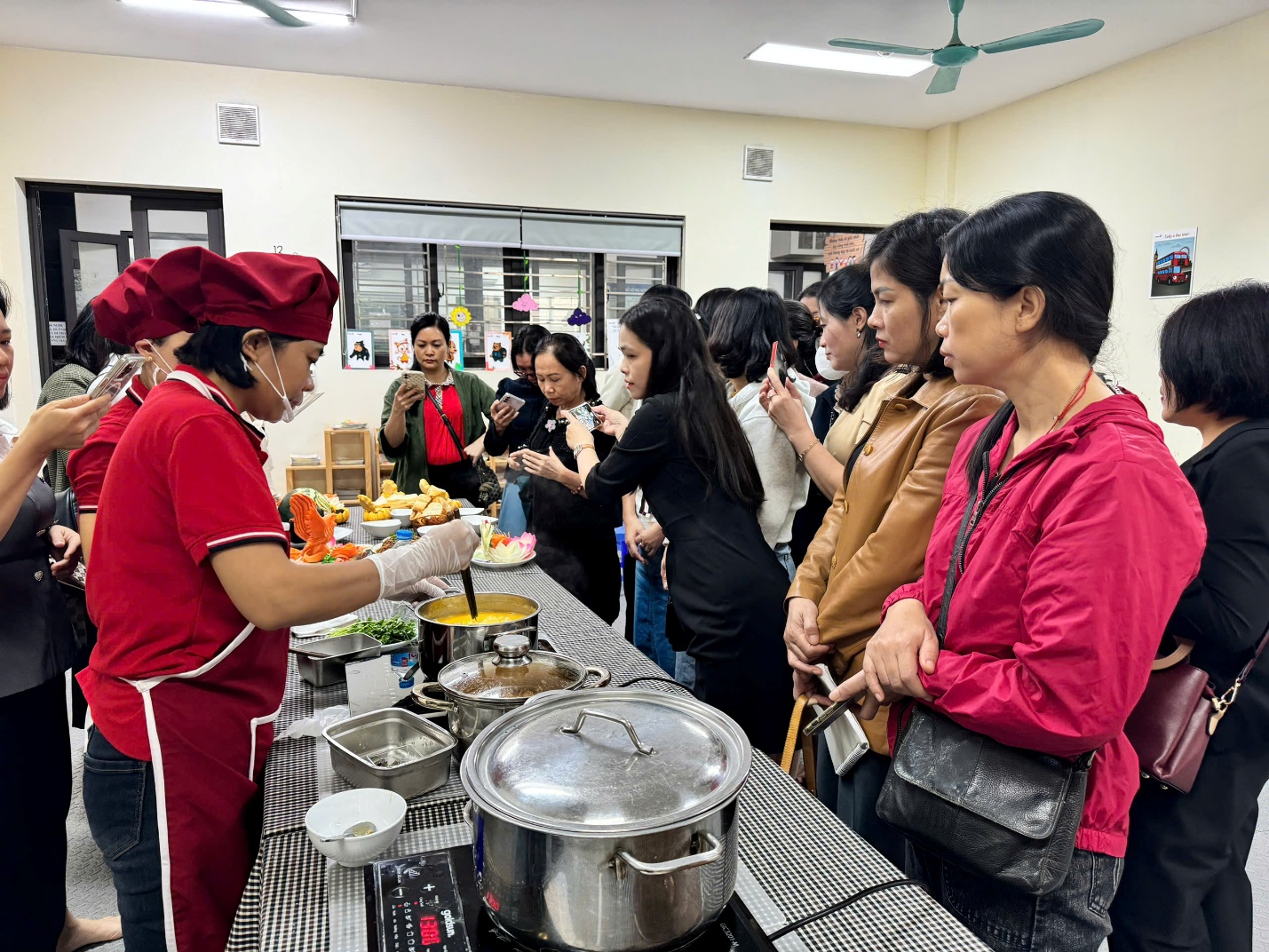 Tại buổi tập huấn, hai nhân viên nuôi dưỡng của Nhà trường đã trình bày cách chế biến nước sốt cho món mỳ spaghetty và món gà cà ri.