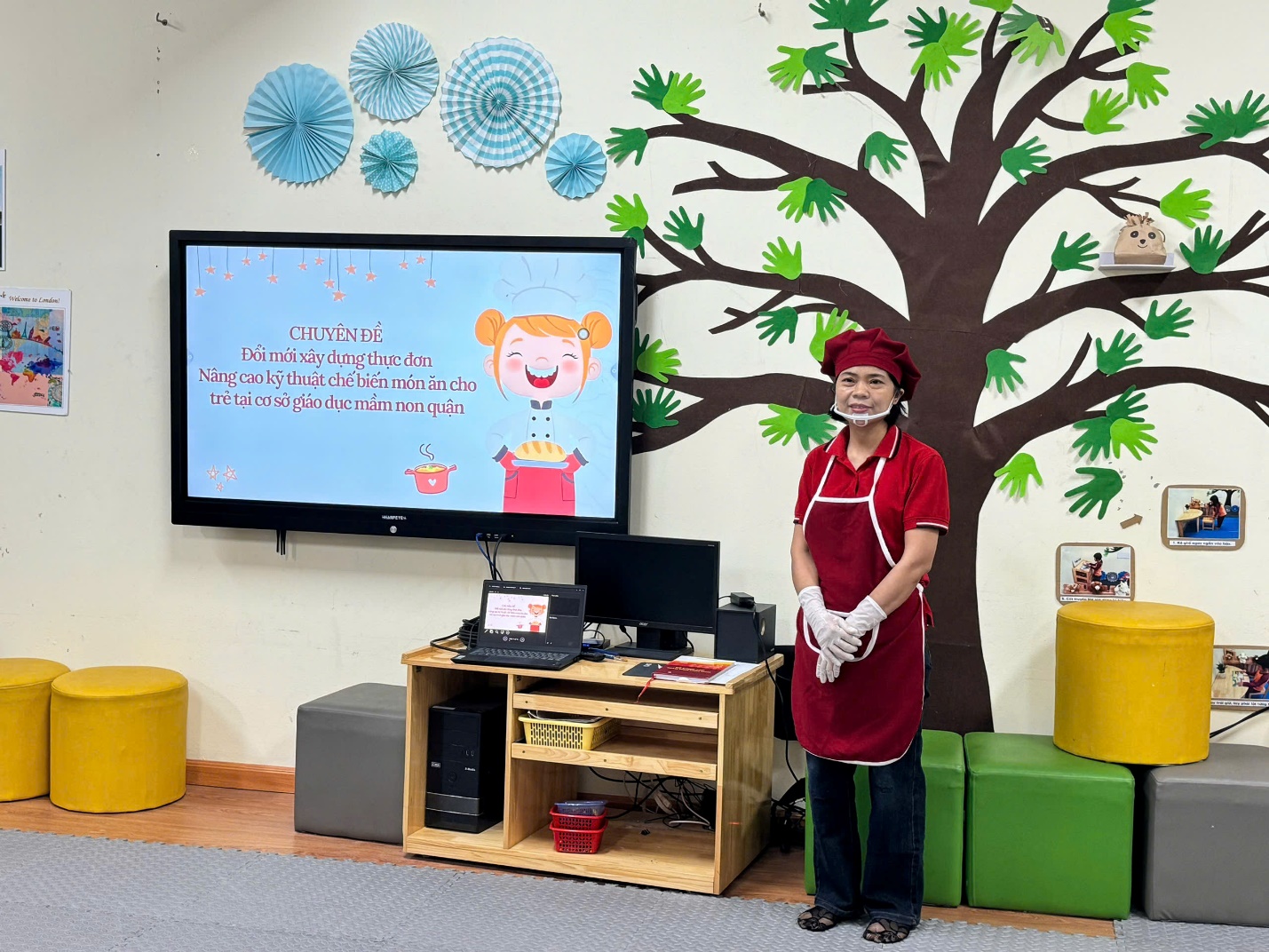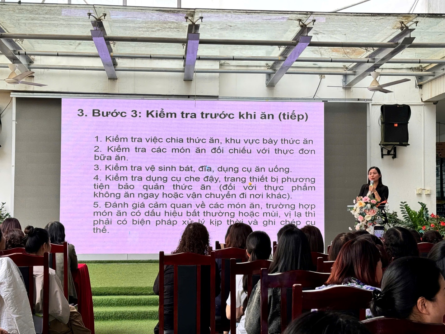 Mở đầu là phần tập huấn lý thuyết của cán bộ Trung tâm y tế Quận với nội dung: An toàn vệ sinh thực phẩm. Qua hoạt động này, đội ngũ cán bộ, nhân viên các nhà trường đã trao đổi, chia sẻ để cùng thống nhất cách làm chung cho hoạt động nuôi dưỡng tại cơ sở.