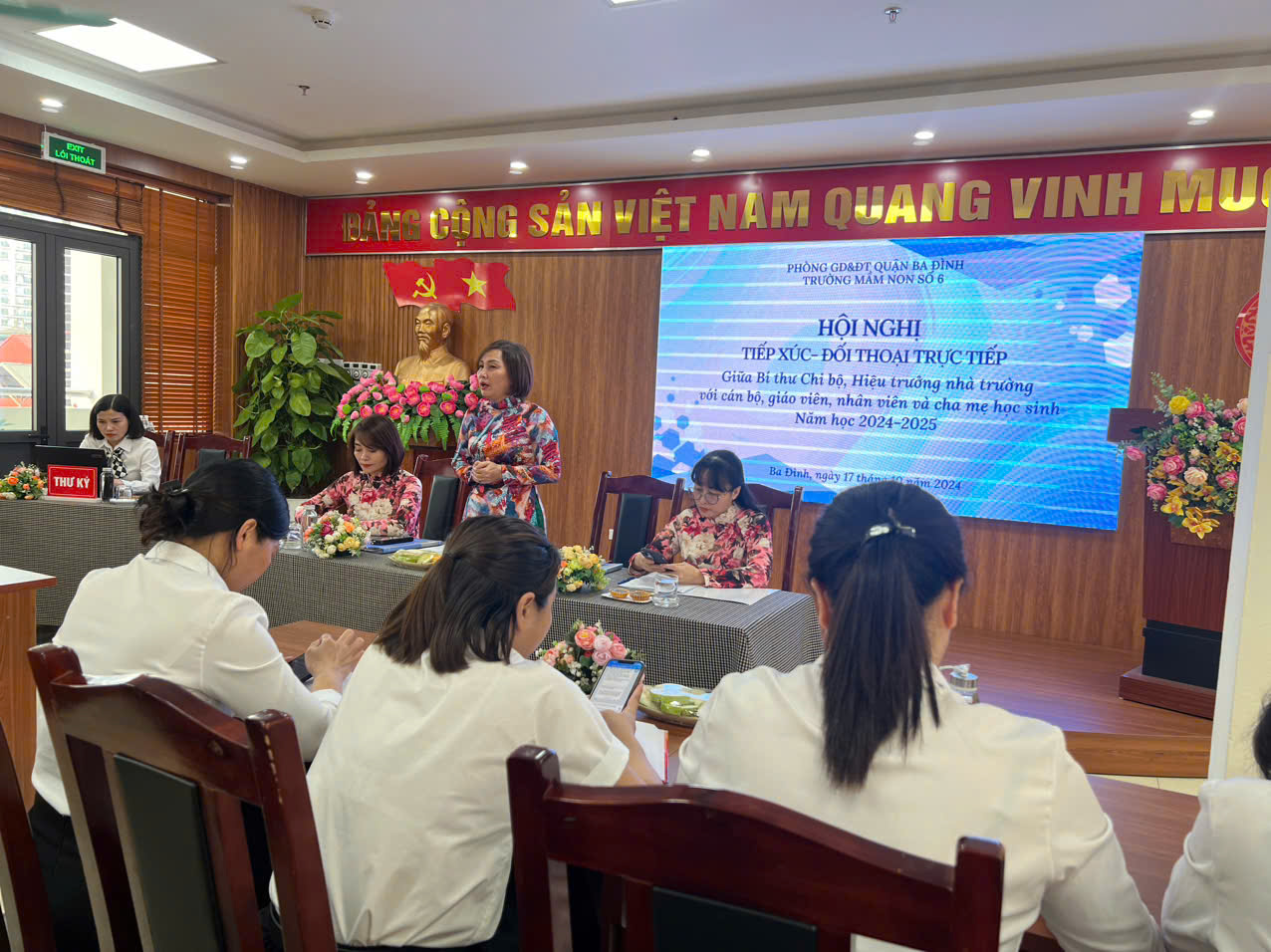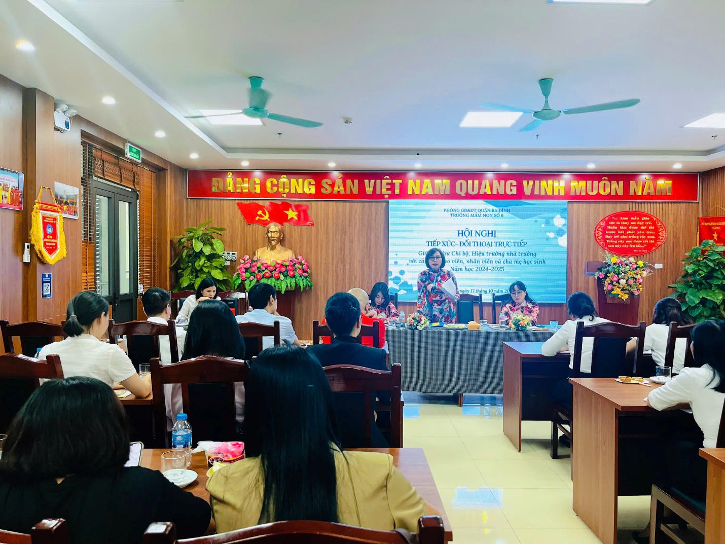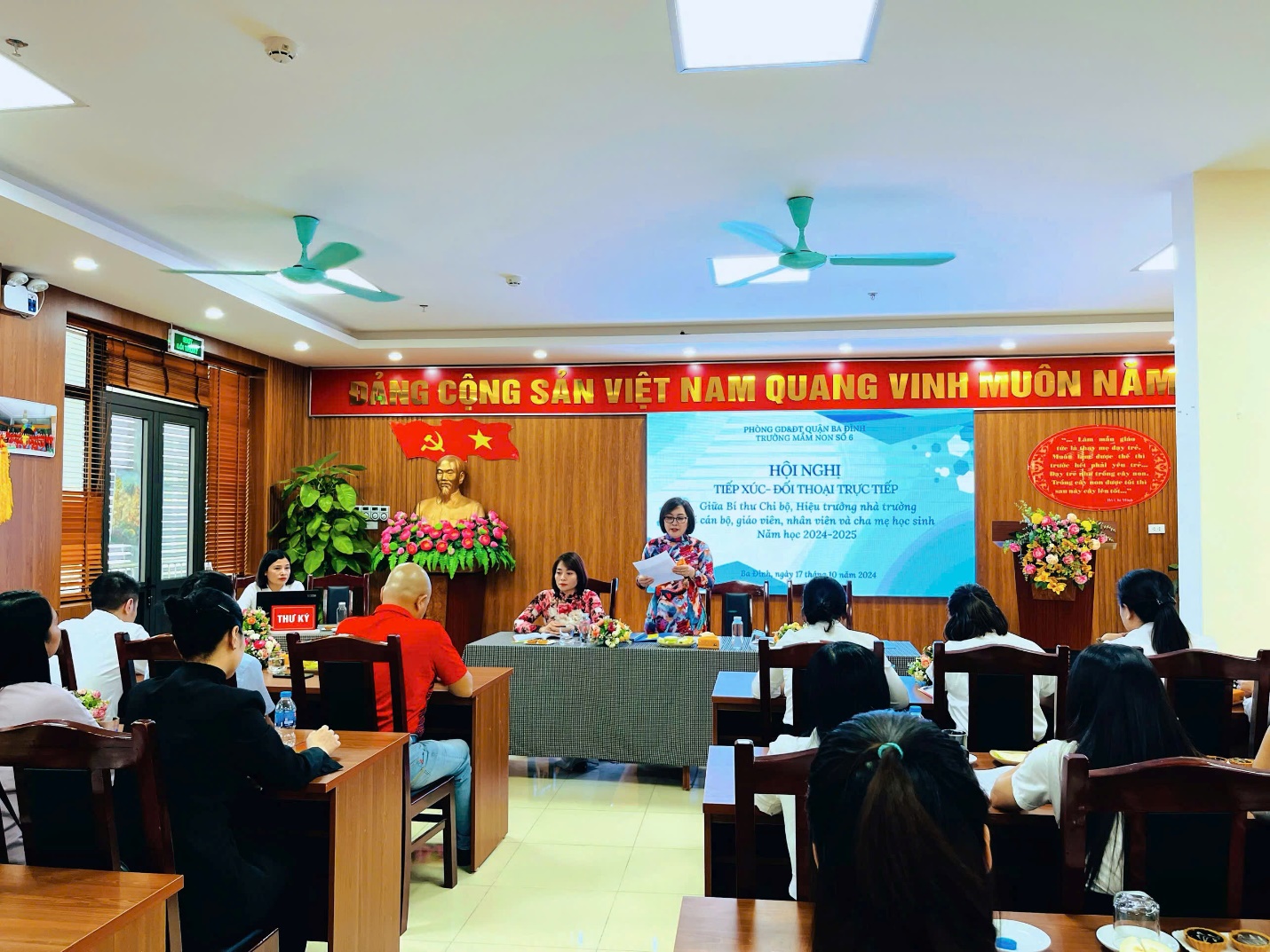 Hội nghị tiếp xúc đối thoại giữa người đứng đầu cấp ủy với giáo viên, nhân viên và cha mẹ học sinh nhà trường nhằm phát huy tính dân chủ, lắng nghe và nắm bắt tâm tư, nguyện vọng của cán bộ, giáo viên, người lao động toàn trường.