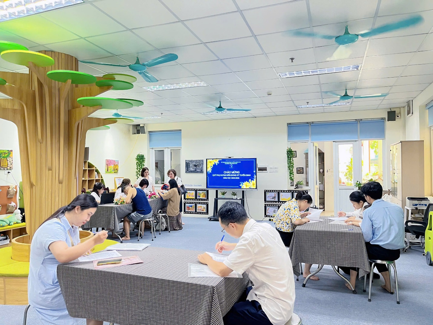 Theo đúng kế hoạch Tuyển sinh, sáng ngày 14/7/2025, Hội đồng tuyển sinh của nhà trường đã có mặt từ sớm để chuẩn bị cho công tác tuyển sinh trực tiếp lứa tuổi Nhà trẻ và Mẫu giáo lớn năm học 2025 – 2026.